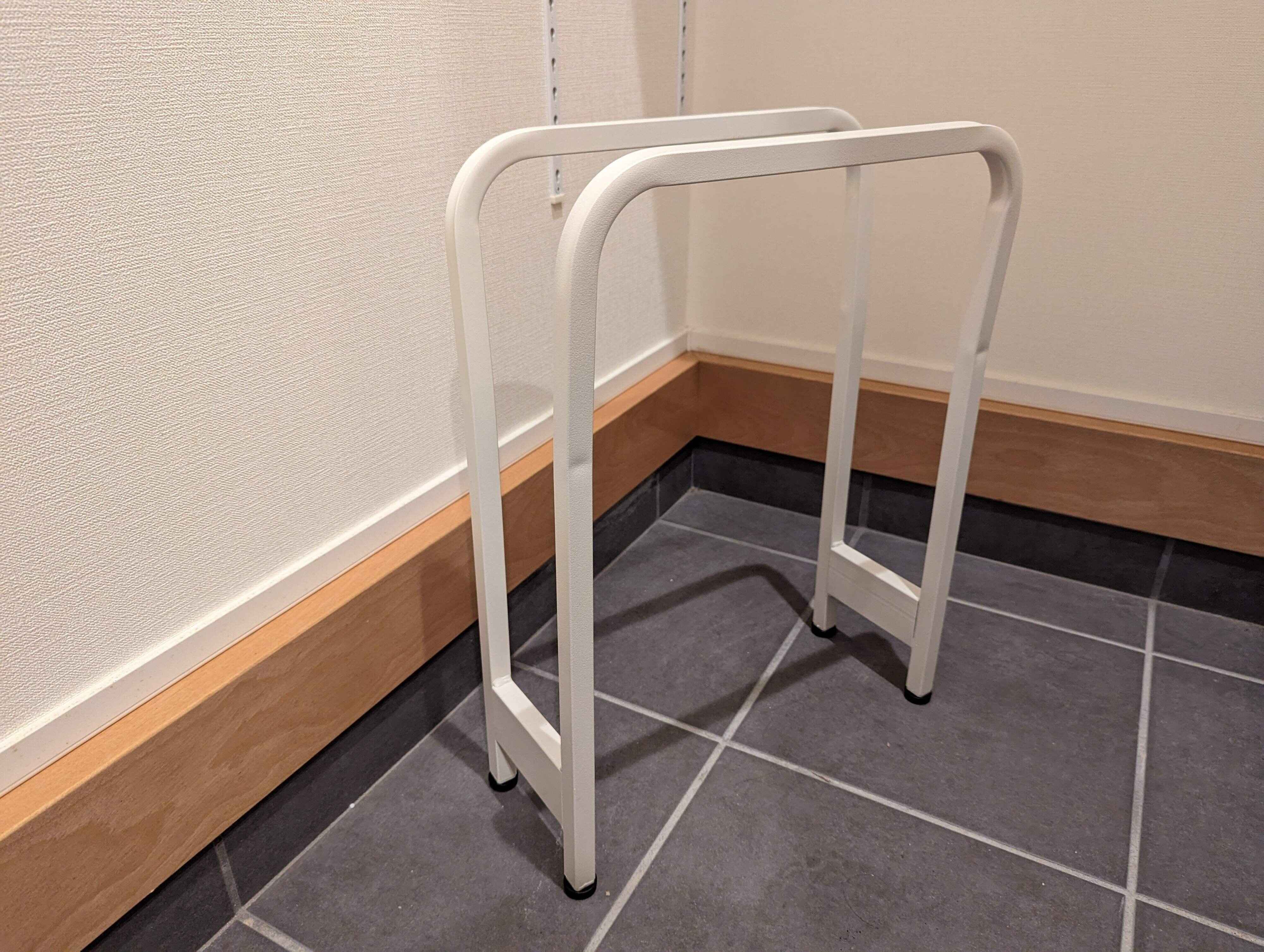 重量は1.56kgあり段ボールが広がったり倒れたりしないように、かつ見た目にもスッキリと保管できます。床との接地面には2cmの高さ調節ネジがついているので、多少の段差があっても設置できそうです。組み立てなくても、箱から出してすぐ使えるのもメリット。カラーは写真のホワイトとブラックの2色展開です。