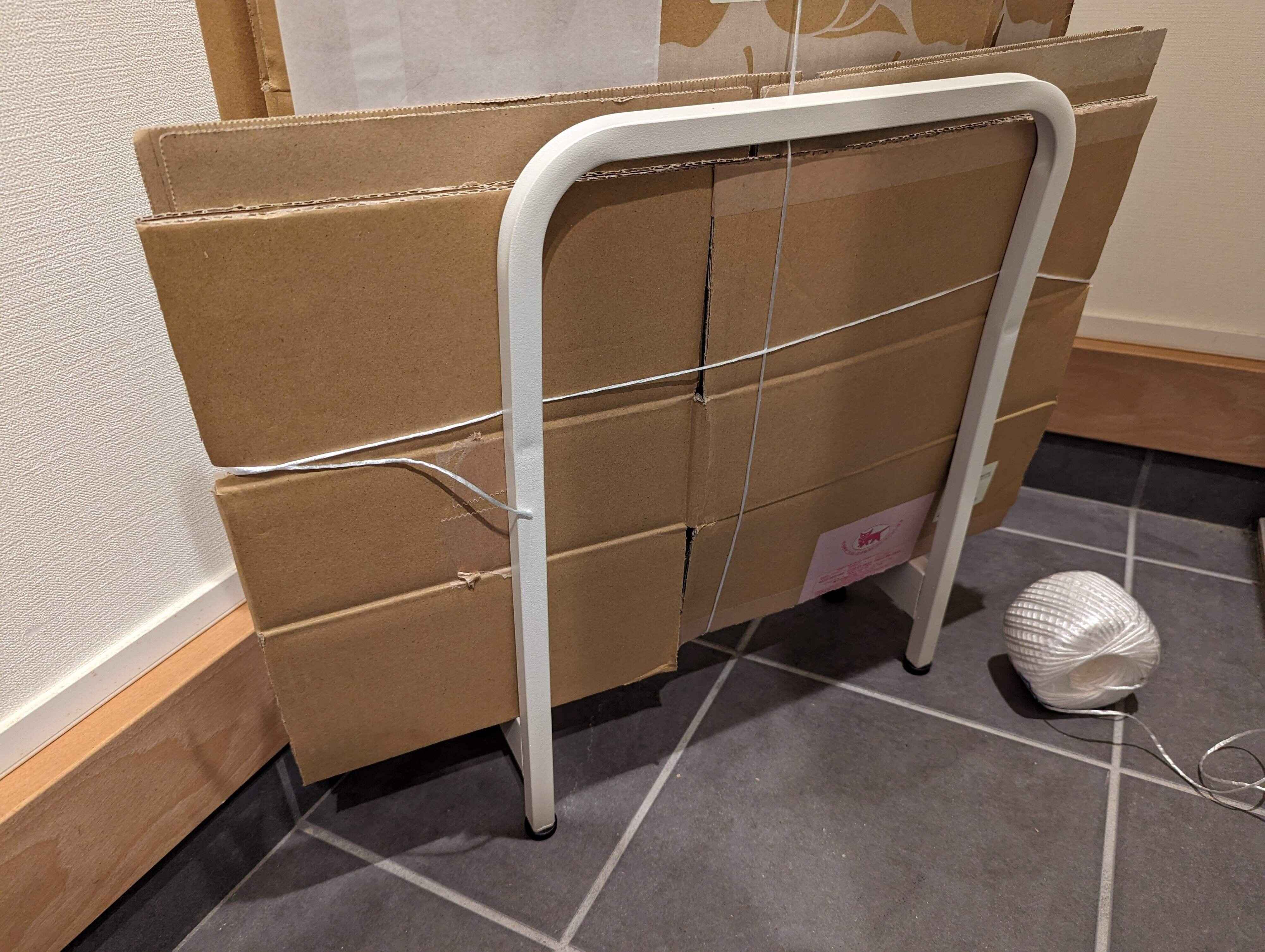 いざ収集日前日も、乱雑な段ボールを紐で縛るという作業が待っています。大量に溜まっていると、床置きで縛るのは大変です。夫婦二人がかりでギュウギュウに圧縮しながら、段ボールの束を回転させてどうにかこうにか縛ったこともあります。