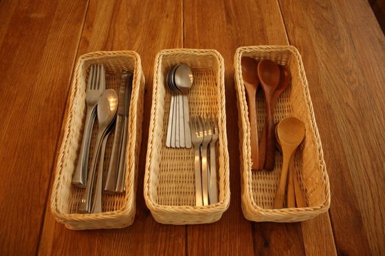 MIINAさんが持つカトラリーの数は約30本。「シルバーのシンプルなものと木製スプーンだけ」と決めているので、見た目も統一感があります。セリアのカゴに種類別に入れて、食器棚に並べて収納しているそう。