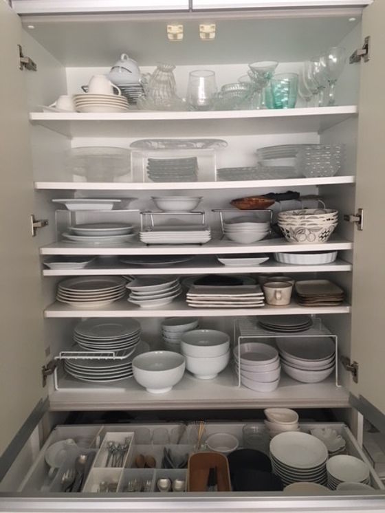 tomoyoさんはゲスト用の食器も持ち合わせているので、全体数はやや多め。それらをすべて食器棚に収めて取り出しやすくするため、アクリル棚や整理ラックを活用しています。数は多くても、きちんと整理整頓されていますよね!