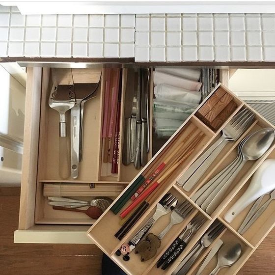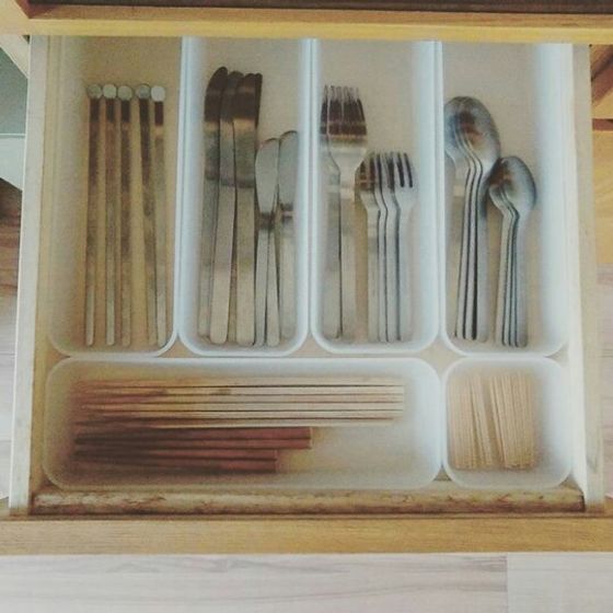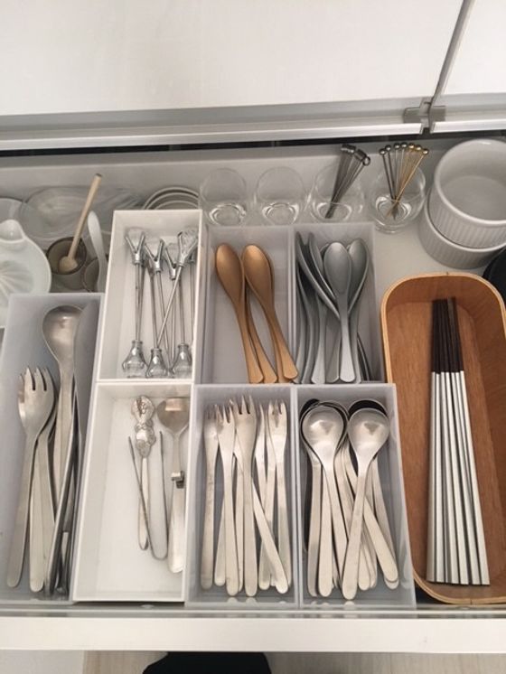 続いては、junkaさんのお宅のカトラリー。5人家族で使う数だけを持っています。引き出しひとつをそのまま使うと全てのカトラリーが収まりきらないため、なんと自作でカトラリーケースを作ったそう! 1軍のケースは上段に、2軍は下段に重ねて収納しています。