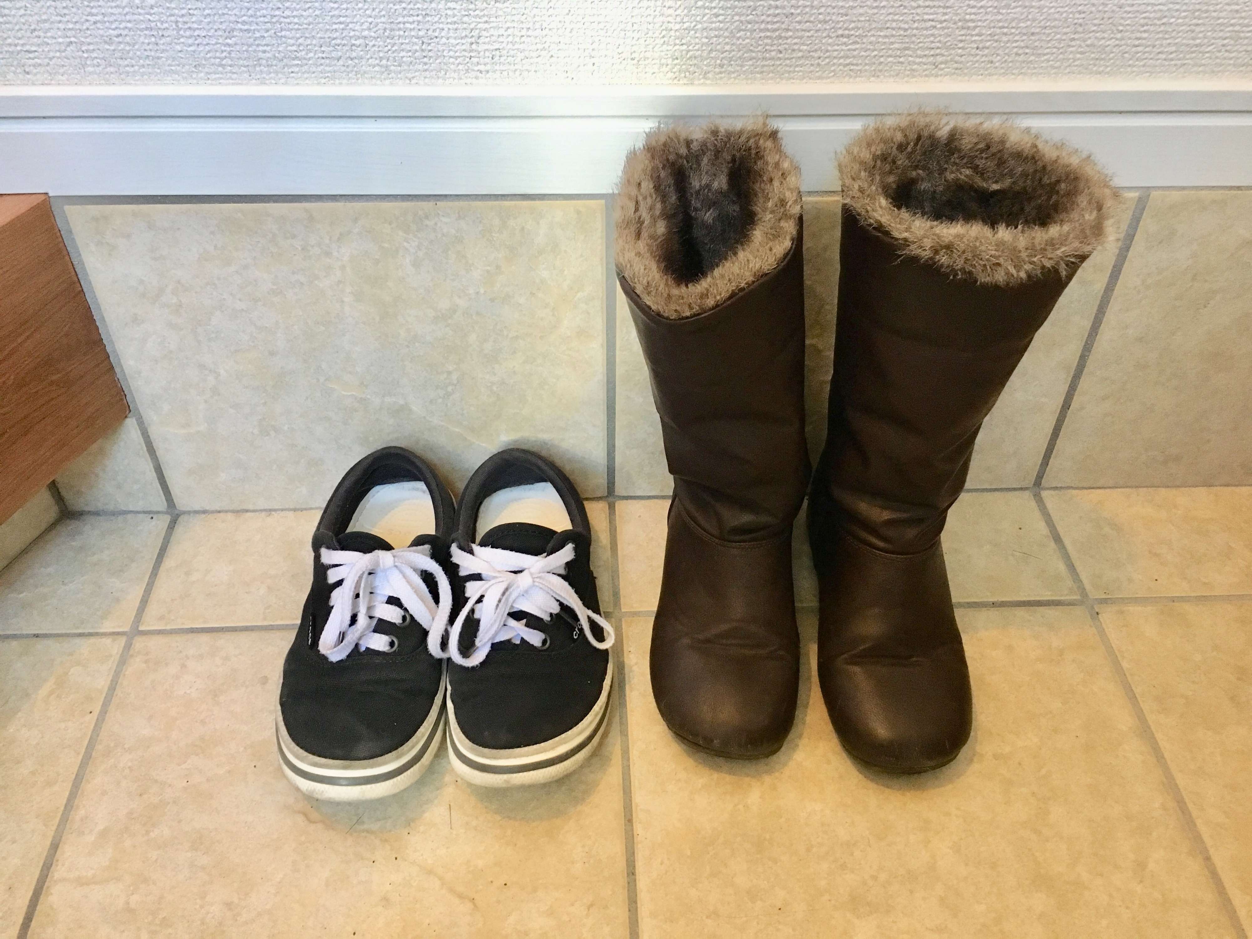 comayoさんのお出かけに欠かせないこの2足。クロックスのスニーカーは3年ほど前に購入。とても軽くて歩きやすく「またリピート買いしたい」というほどお気に入り! ブーツも3年前から愛用。シンプルなので仕事や子どもとのお出かけなど、幅広いシーンで大活躍しています。