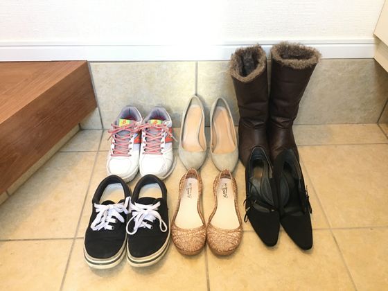 サンキュ!ブロガーcomayoさんの靴は全部で6足。その中には冠婚葬祭用やスポーツ用など、用途が限定されたものもあり、デイリー用は4足です。さらに、ブーツやメッシュのフラット靴など、シーズン物を2足所有。シーンや用途がだいたい決まっているので、毎日履く靴に悩むことなく、さっと出かけられます。