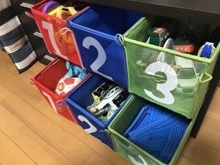 ダイソーで購入できる取っ手付きの入れ物を使って、箱の中をあふれさせないように収納していきます。取っ手がついてるので、お子さまでも簡単に取り出したり、片付けたりすることができますよ。