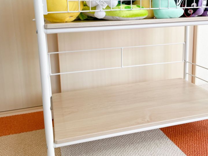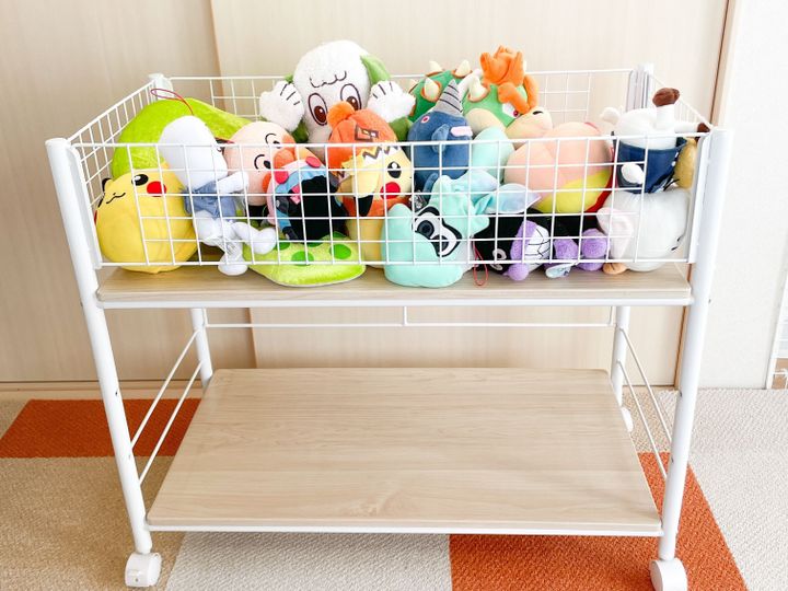 実際にぬいぐるみを収納してみました!落下防止ネットが付いていてぬいぐるみ収納にちょうど良いです。ぽいぽい入れられるのも収納しやすくて子どもでも収納できていい感じですね!