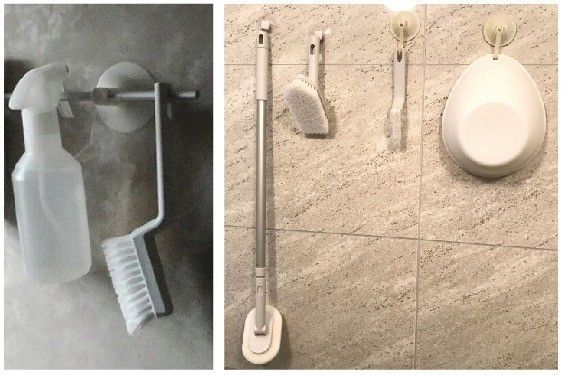 お風呂の掃除グッズに無印良品を選ぶ人も多数! サンキュ!ブロガー藤原絵美子さんは、洗剤を入れるスプレーボトルとタイル目地ブラシを吸盤付きのアルミハンガーに引っ掛けています。海老原さんはバス用スポンジ、ブラシなどを愛用。