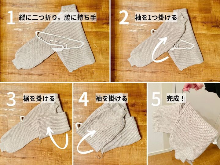 ニットもハンガー収納。縦半分にたたみ、脇の部分にハンガーの持ち手がくるように置きます。袖→裾→袖の順にかければ、ズレたり伸びたりする心配もありません。