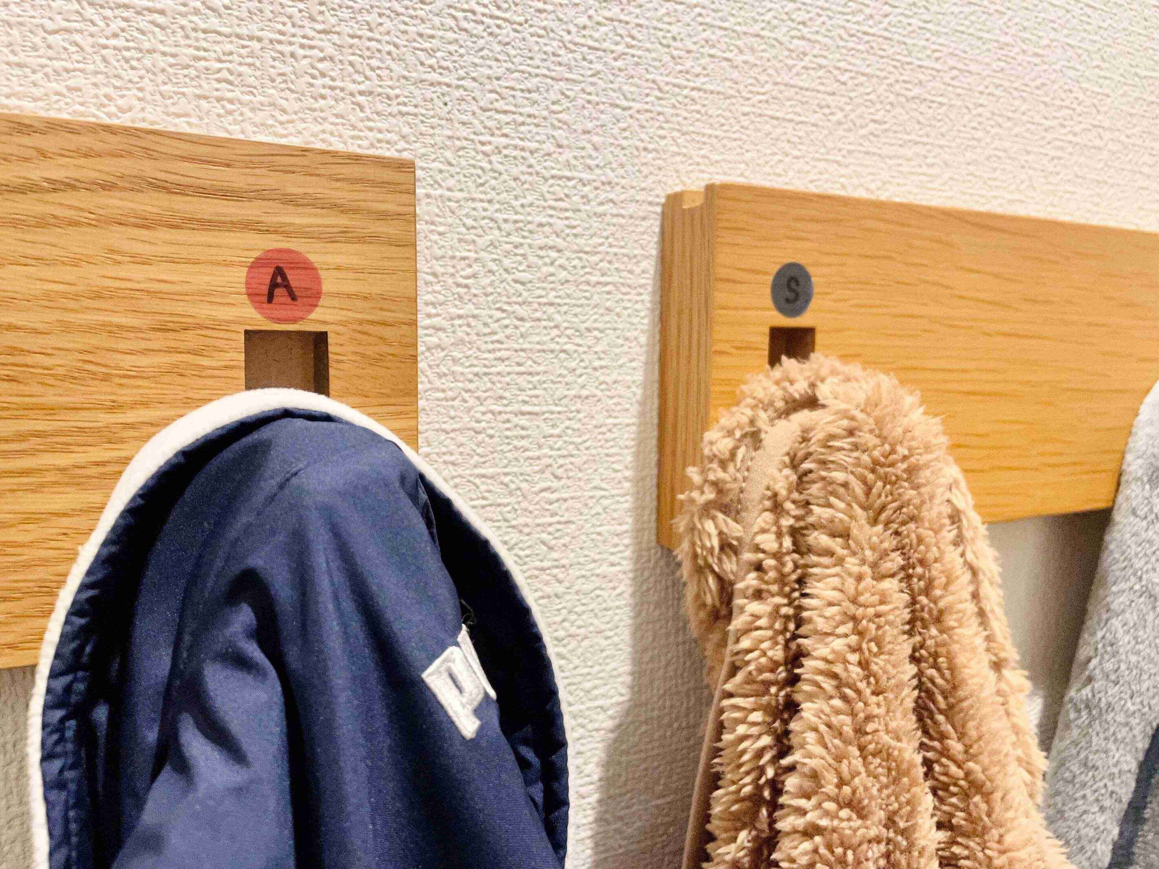 家族それぞれ場所を決めて、帰ってきたら自分でかけてもらいます。目印のシールを貼ると、お子様も分かりやすいですね。