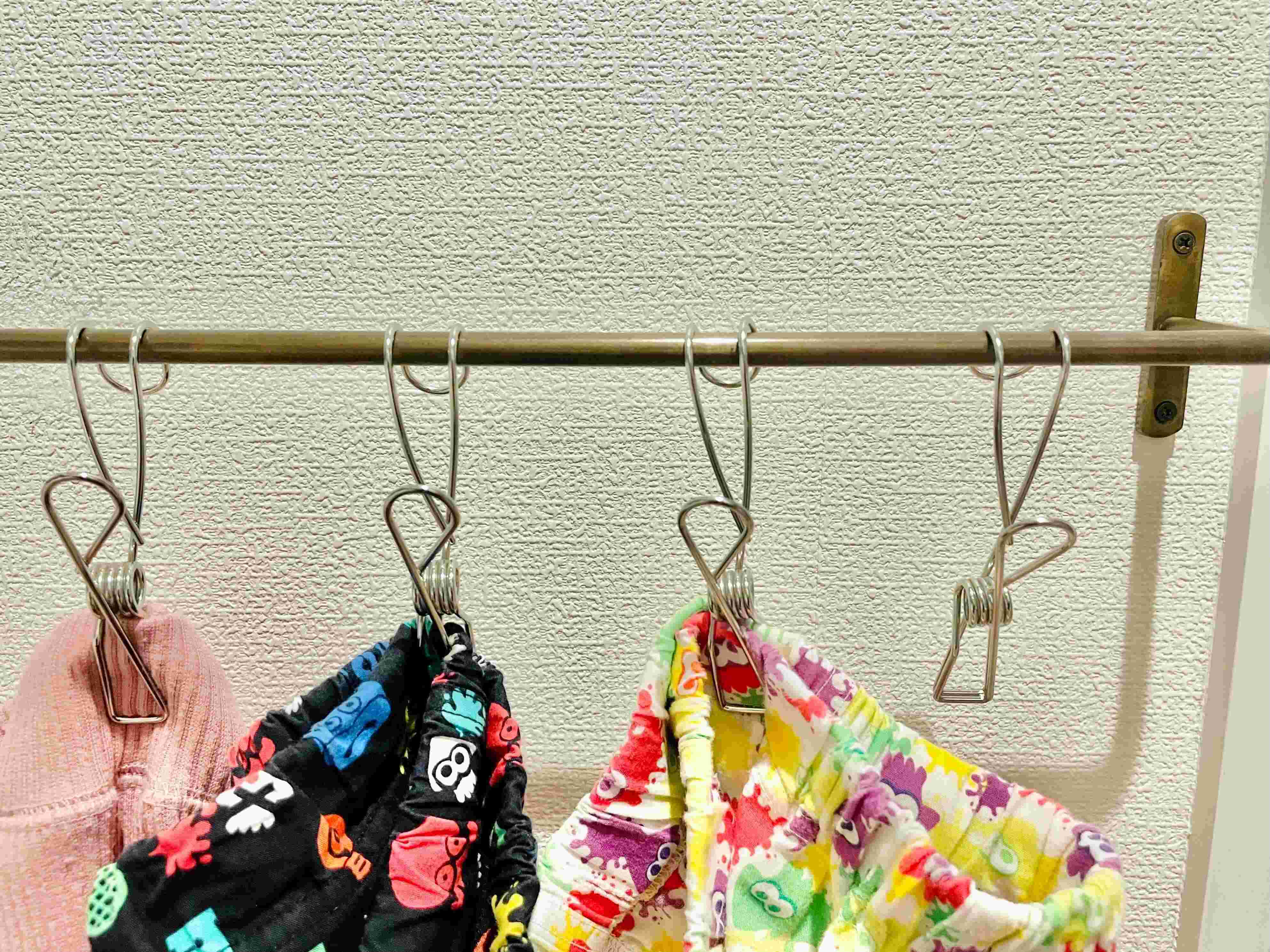使っているのは、引っかけられるタイプのクリップ。ハンガーより省スペースで、子どもでも簡単にかけられますよ。