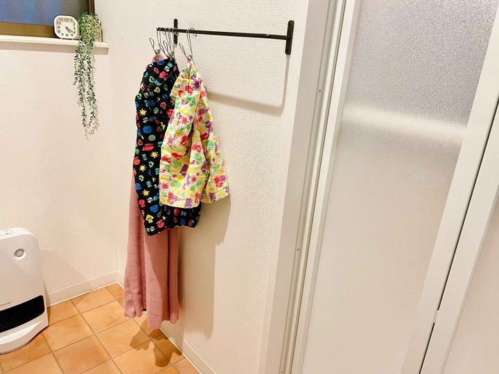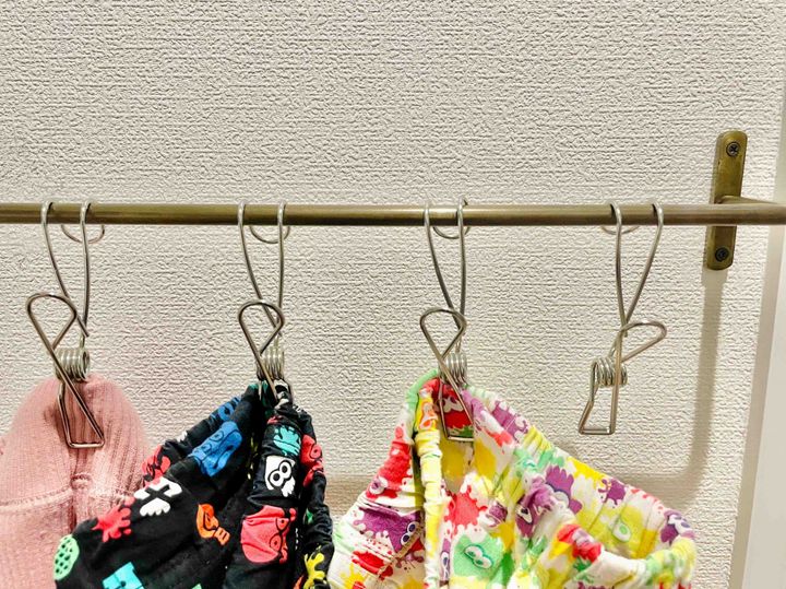 冬場はパジャマもすぐには洗わないので、洗面所のタオルバーにかけています。毎日ハンガーにかけるのは面倒なので、クリップで挟むだけ!