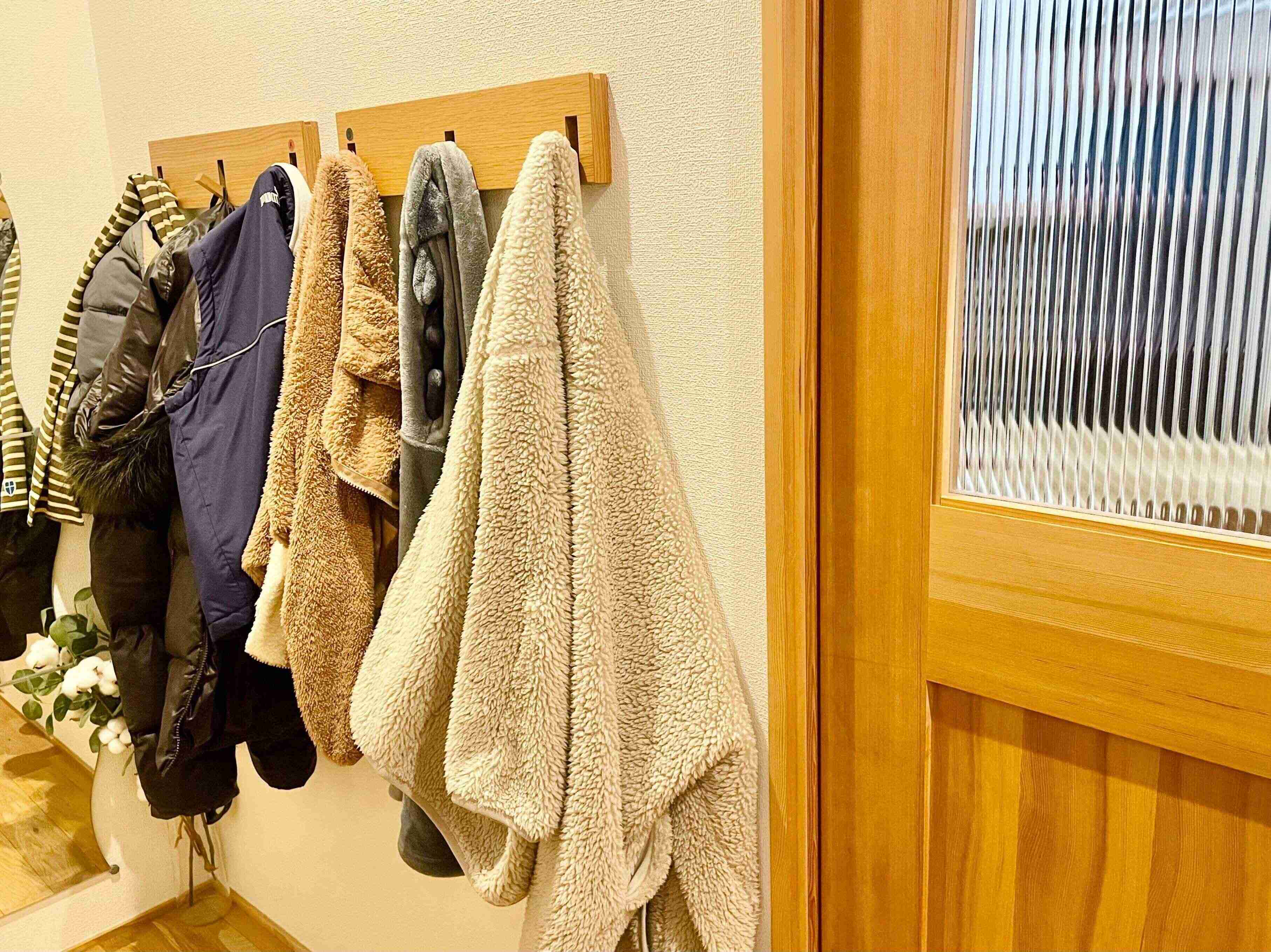 場所を取るアウターは、玄関を入ってすぐの廊下が定位置。壁にフックを取り付けて、そのまま引っかけるだけにしています。