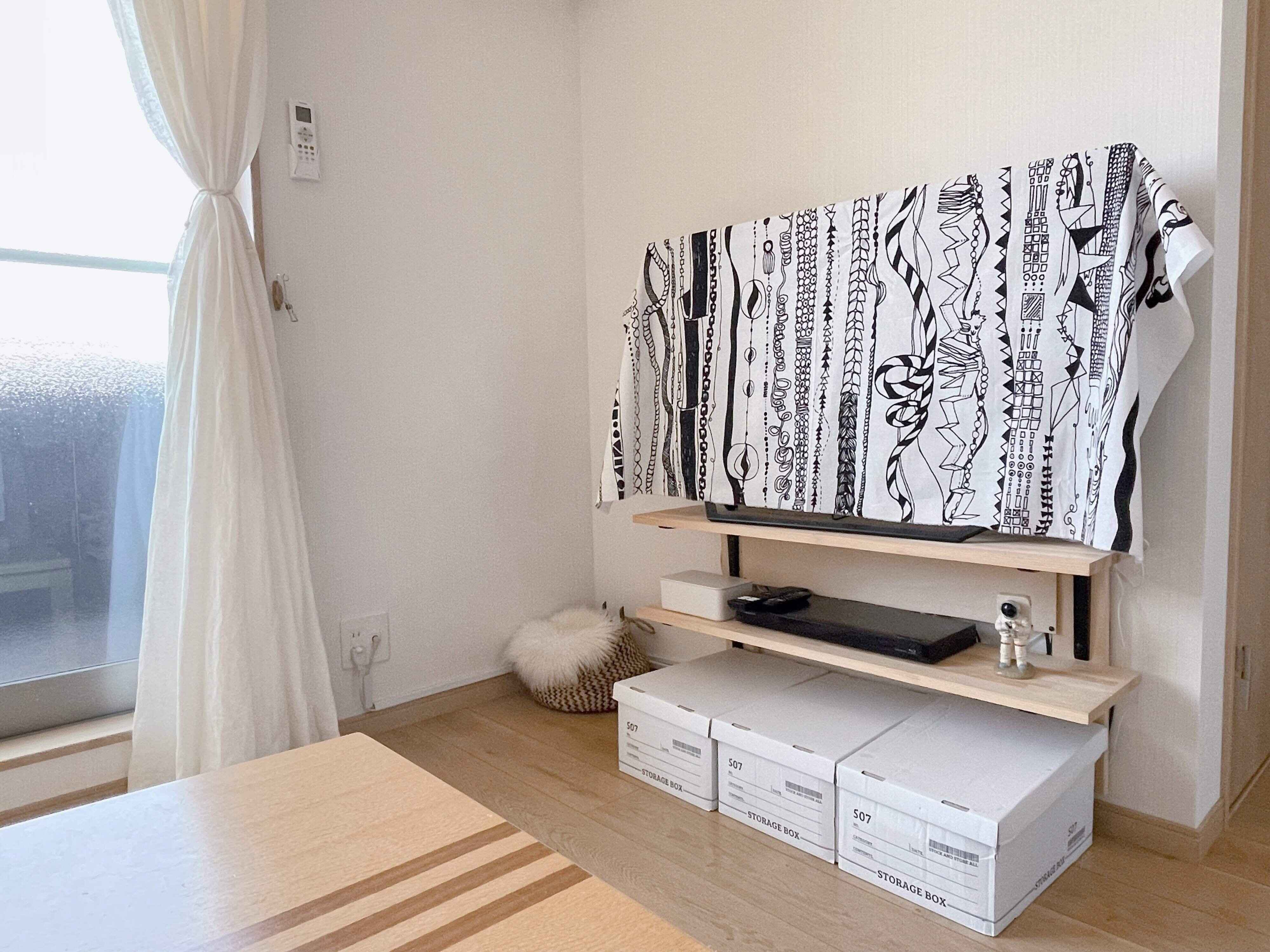 それまでテレビ台に収納していた本は、白い段ボールにいれてオープン棚下に収納。おもちゃは別場所へ移動しました。