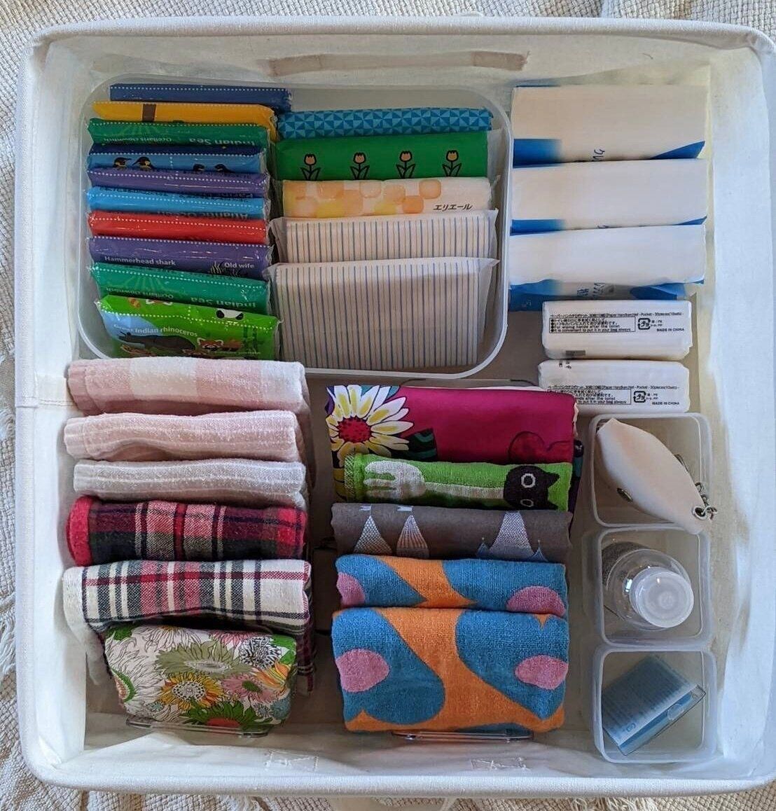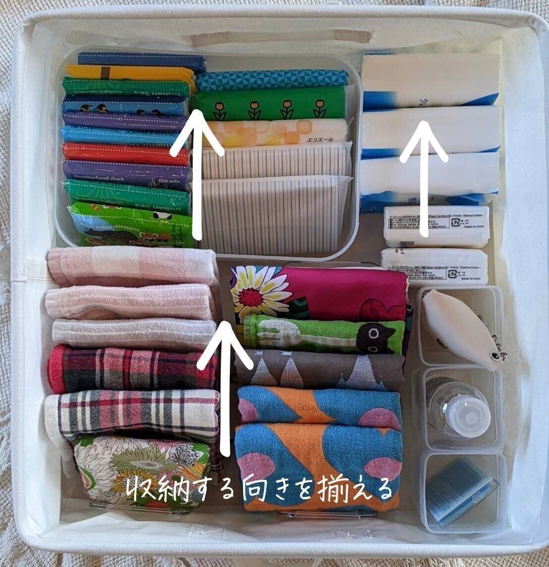 我が家では、ハンカチと一緒にポケットティッシュや、手指消毒用のアルコールなどを一緒に収納しています。これらは、出かける際セットで持ち出すことの多いアイテム。同じ場所に向きを揃えて収納することで、テンポ良くスムーズに取り出すことができます。