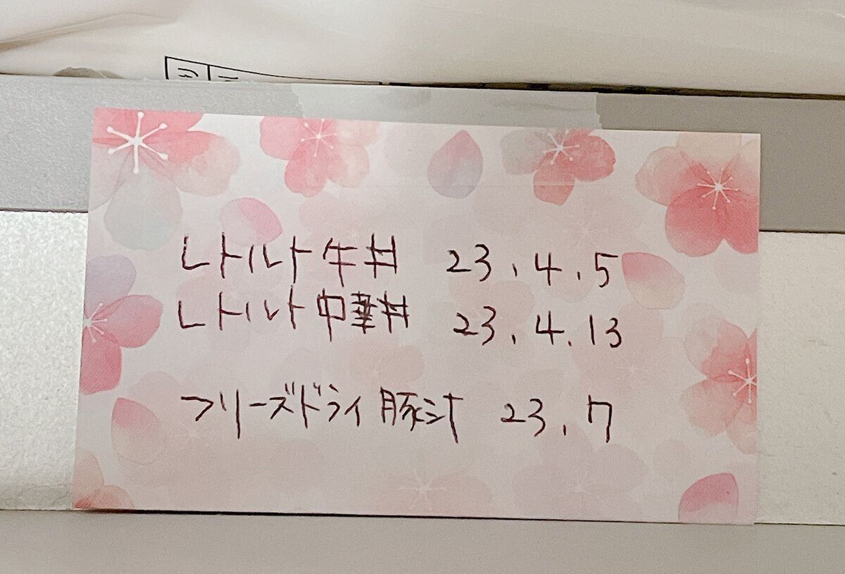 引き出しの奥に収納してあるレトルト食品とフリーズドライ食品は引き出しの1番手前になる位置にメモに書いて。