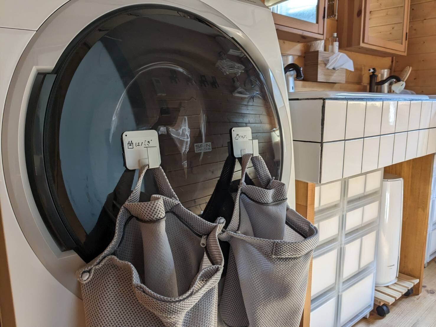 各々脱いだモノをそのまま放置されては仕分けの手間が増える!と言うことで、洗濯ネットは洗濯機のドアにかけっぱなし収納。