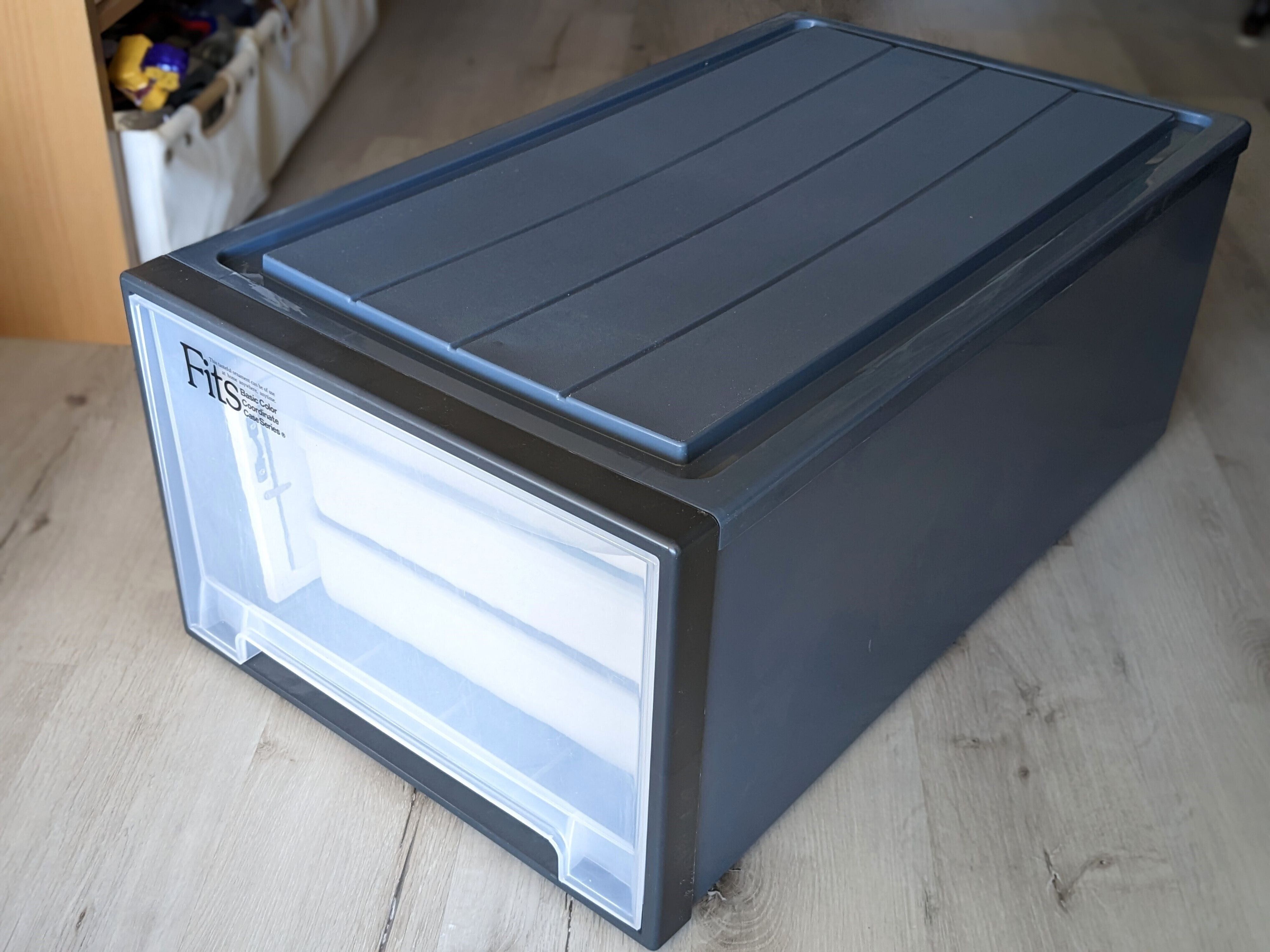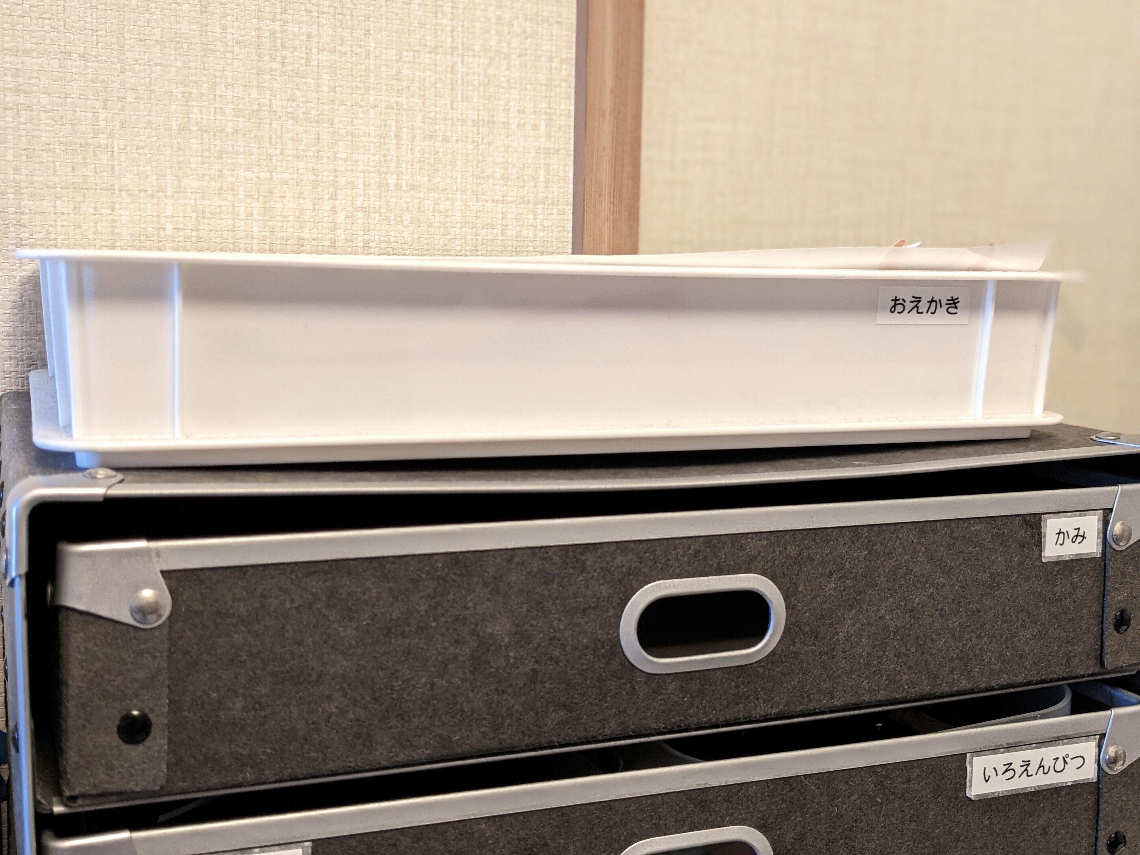 わが家では、家で描いた絵や折り紙などを保管する一時保管ケースと、園や学校で製作した作品や長期的に残しておきたい思い出アイテムを収納する大きめの衣装ケース1つを用意。