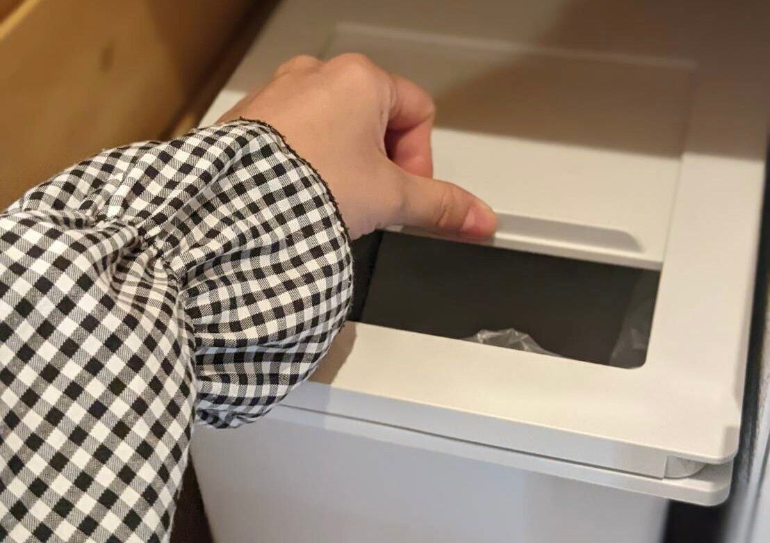 わが家で使っているのは、無印良品「ポリプロピレンフタが選べるダストボックス」シリーズのスライド窓付のモノ。