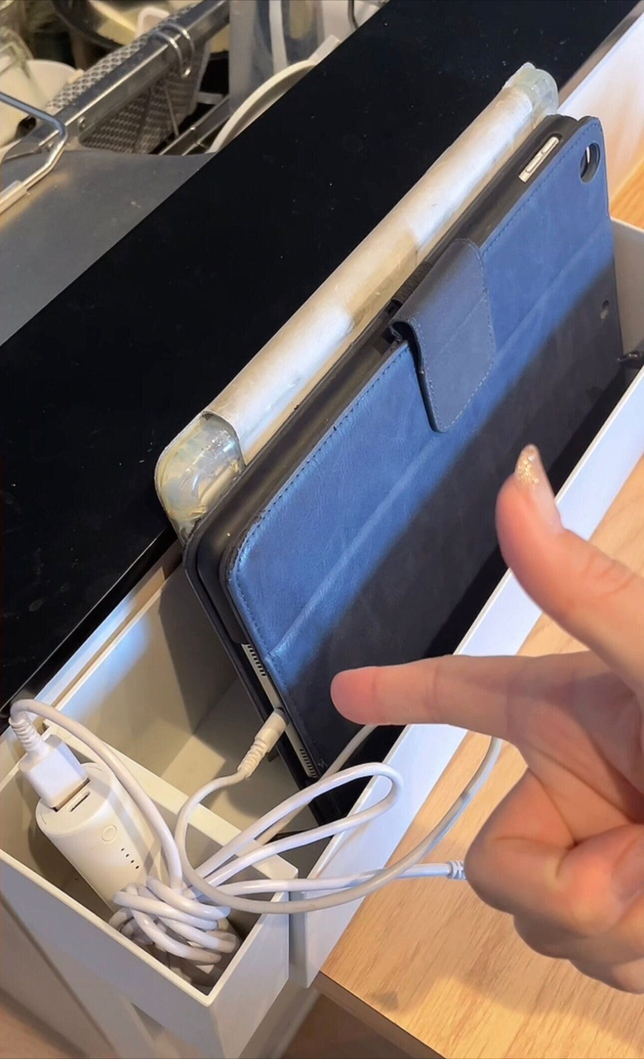 ファイルボックスの穴からコードを通し、タブレットなどを立てて収納可能!