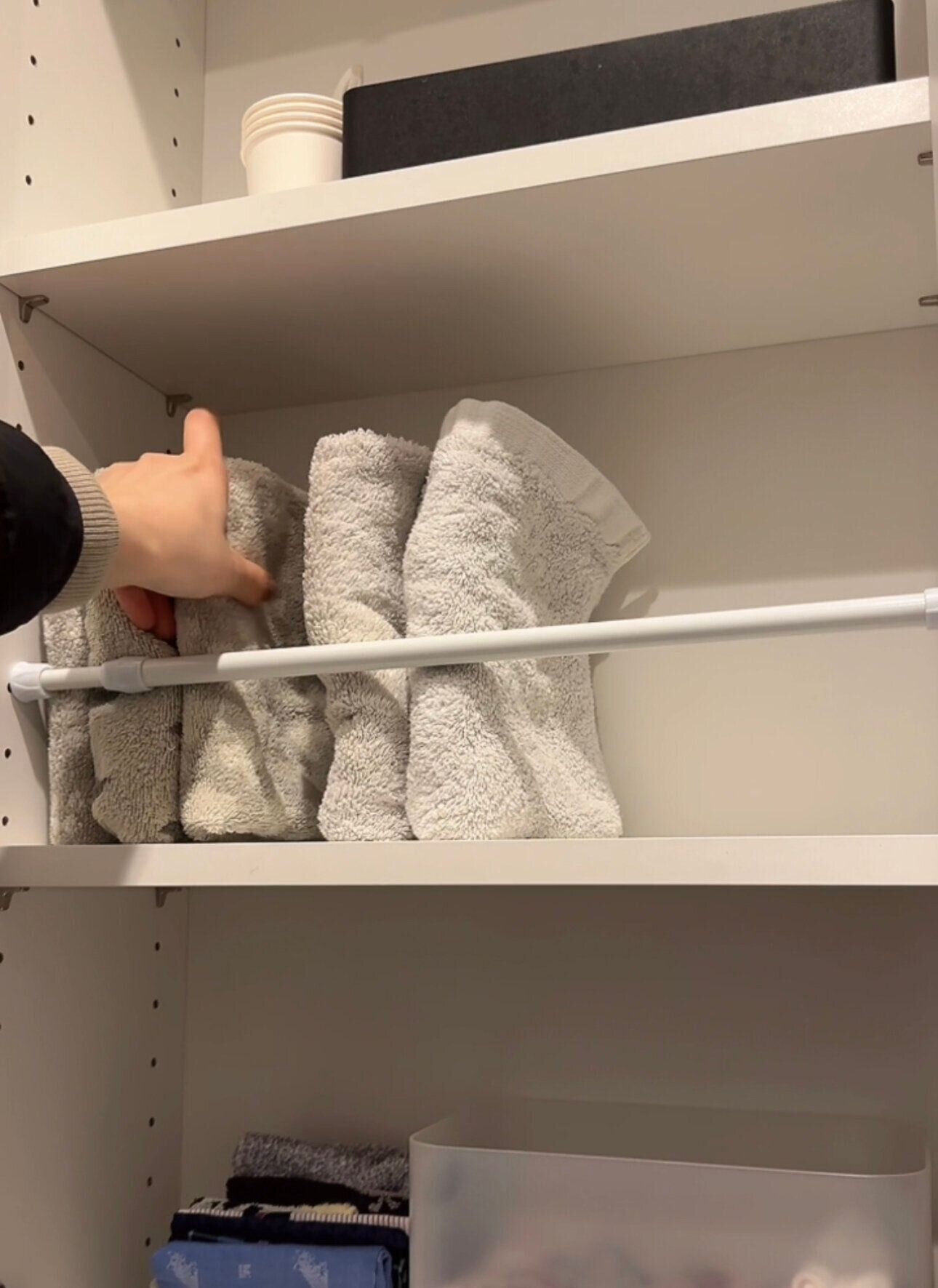 タオルを立てて、突っ張り棒でストッパーにするだけで、取り出しスムーズに♪