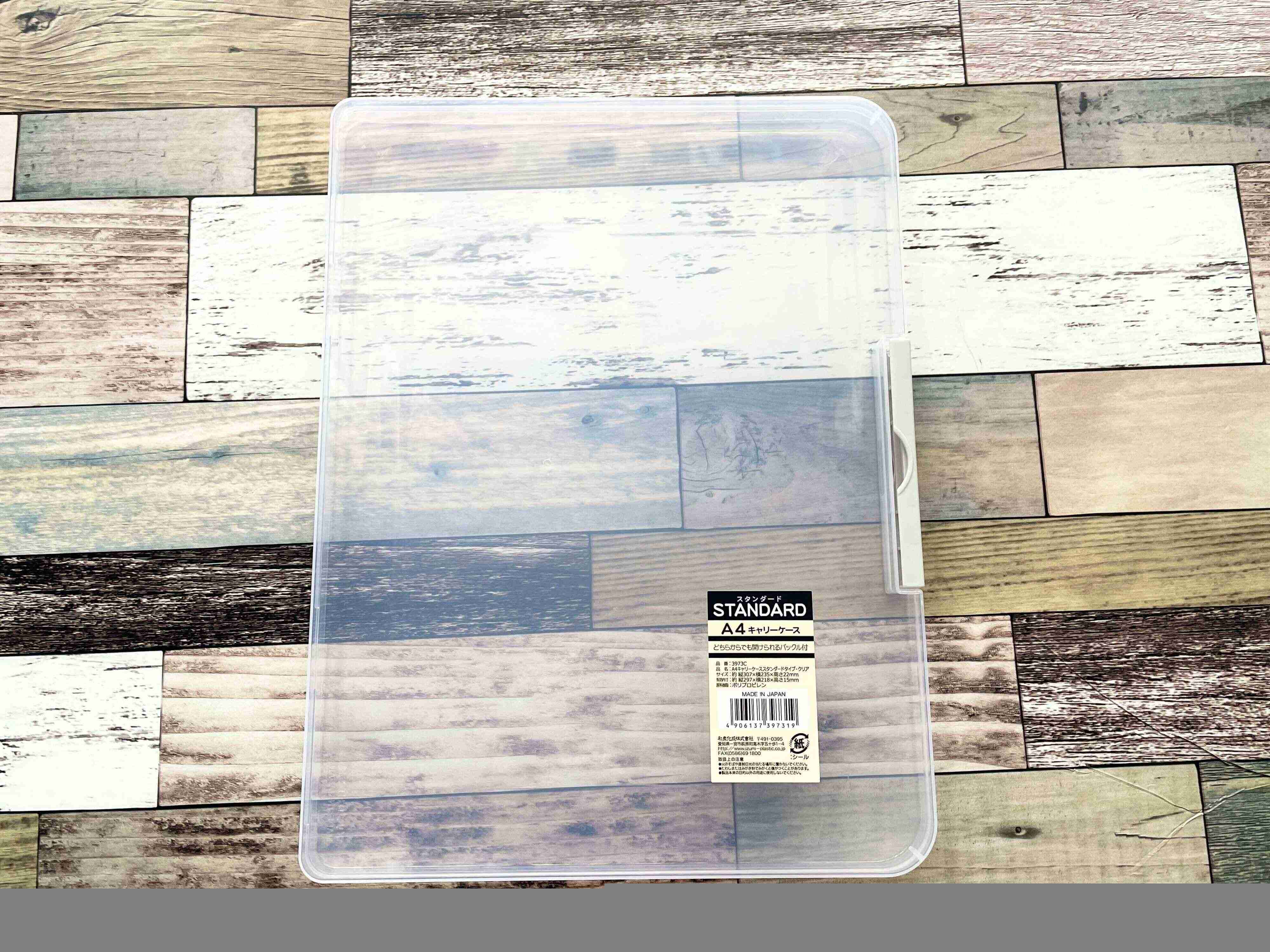どの100均にも似たようなケースがありますが、私はセリアの「スタンダードA4キャリーケース」の薄さと、留め具が一か所で開け閉めしやすいところが気に入り、これにしました。価格は110円です。