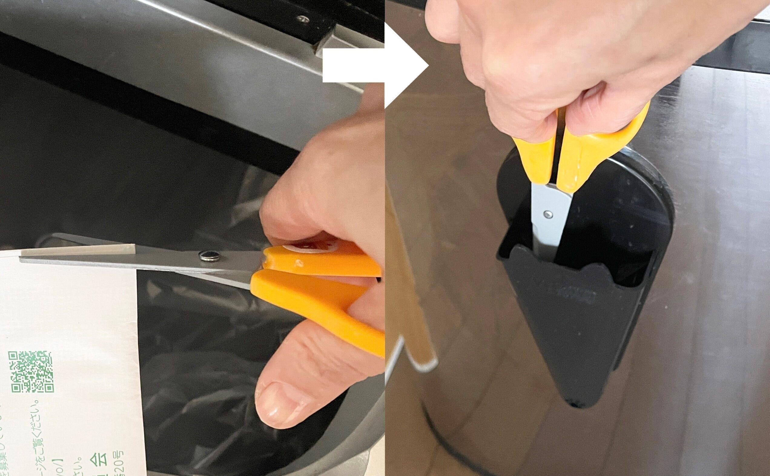 ゴミ箱にハサミがセットされていると、とても便利なんですよ。