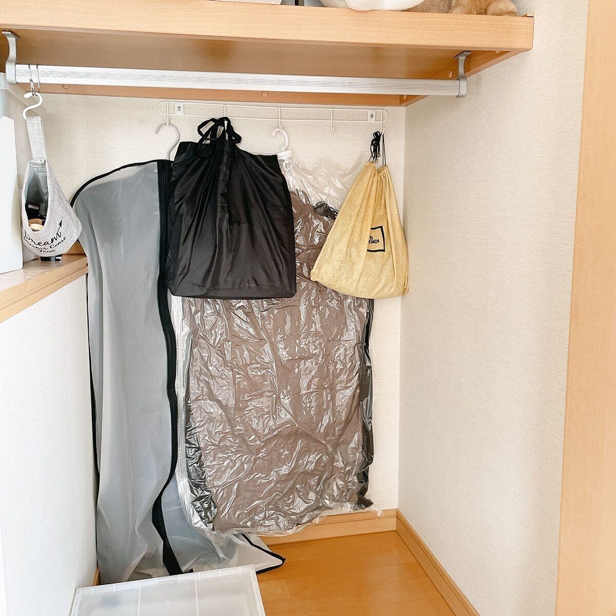 奥行のあるクローゼットなので、奥にフックを取り付けてそこにコートを収納しています。