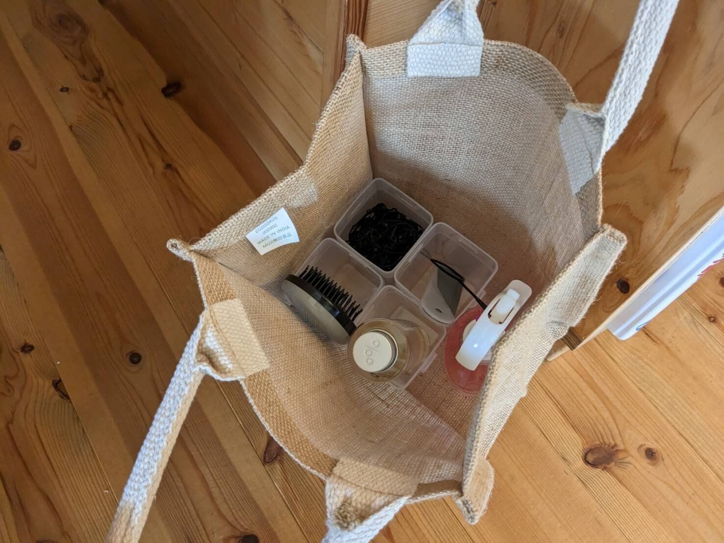 わが家のバタバタな朝の時間に大活躍なのが、娘たちのヘアセット用品を収納したこのバッグ!ヘアブラシ、くし、ヘアゴムにオイルなど、ヘアセットに必要なアイテムを「おまとめ収納」しています。