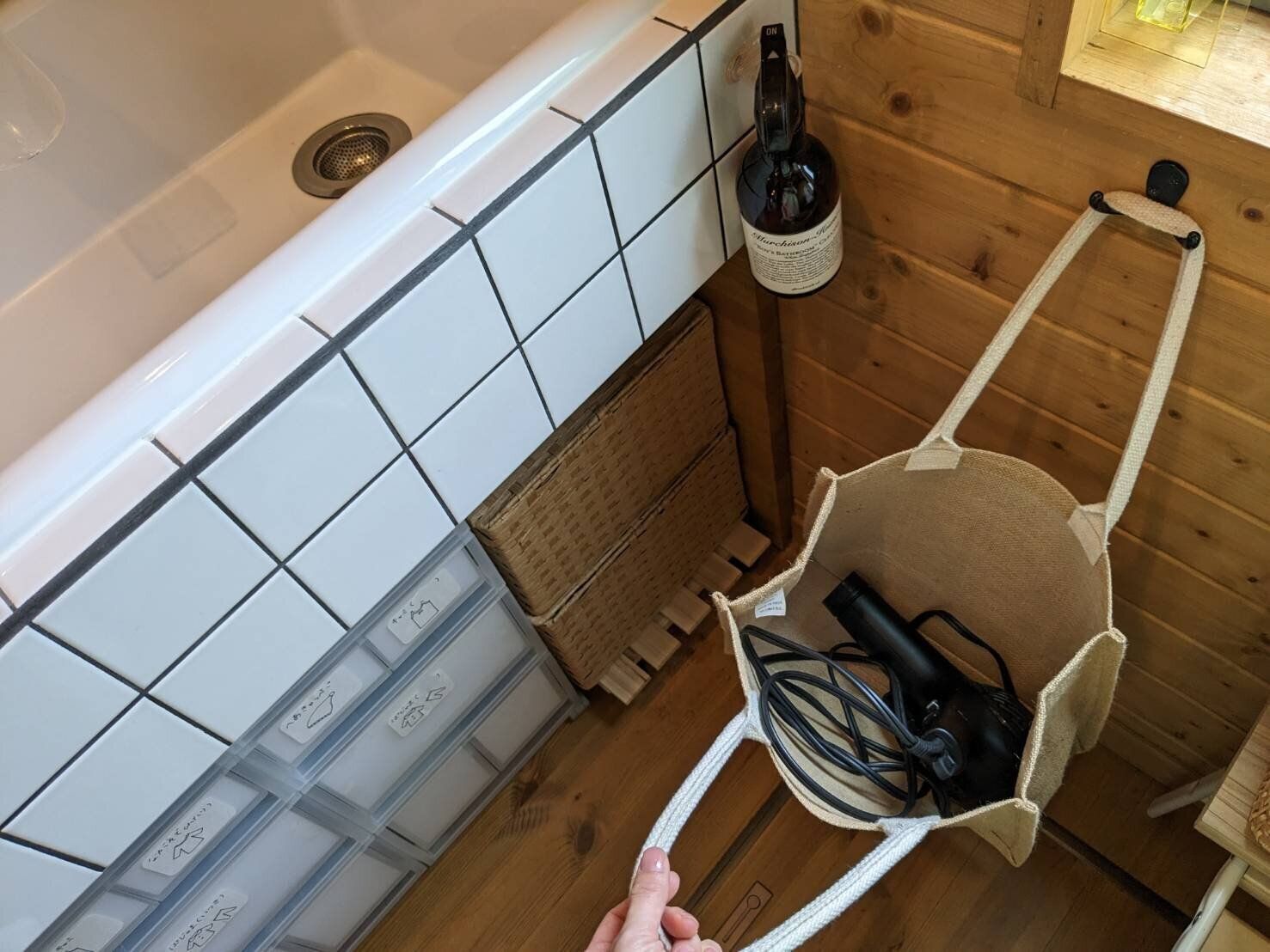 フックにかけて「浮かせる収納」にすることで、省スペースかつ掃除もしやすくなりますよ。