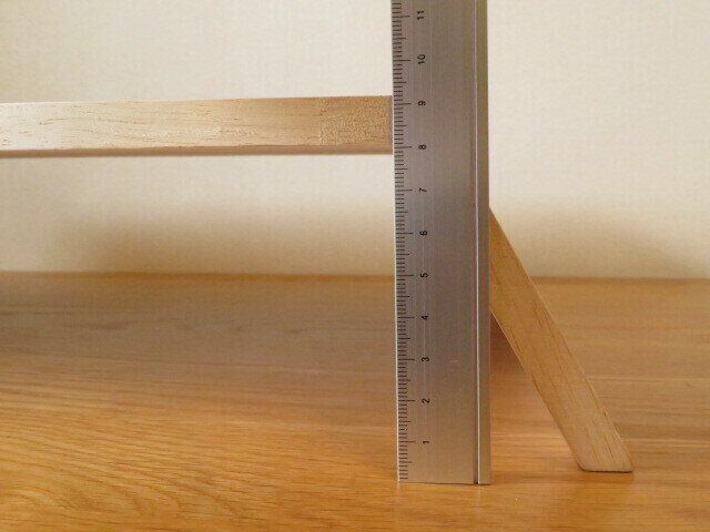 幅は上が38cmで下が48cm弱、奥行きが23cm。高さは下の空間が8cm、全体が9cm強です。台の厚みは12mmくらい。