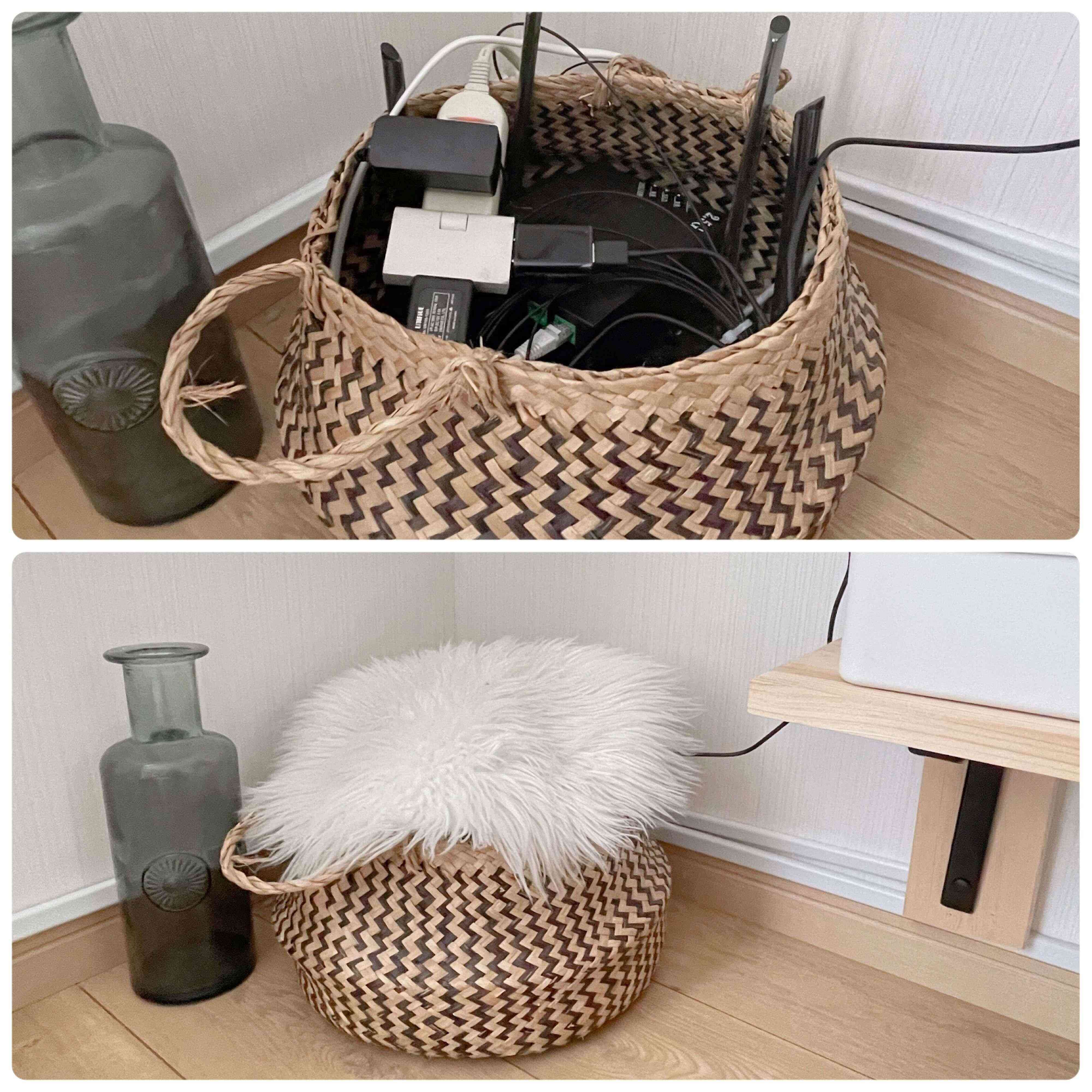 2.配線やルーターはおしゃれなカゴに入れて布で隠す