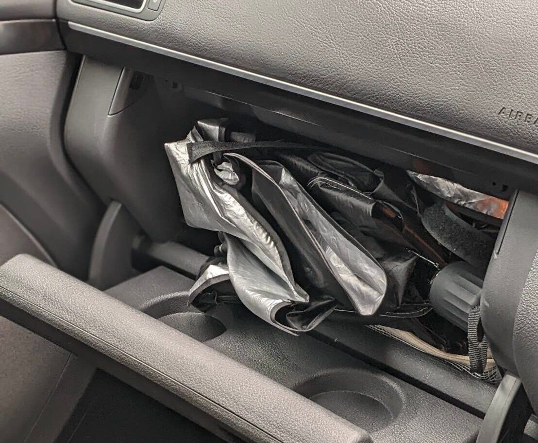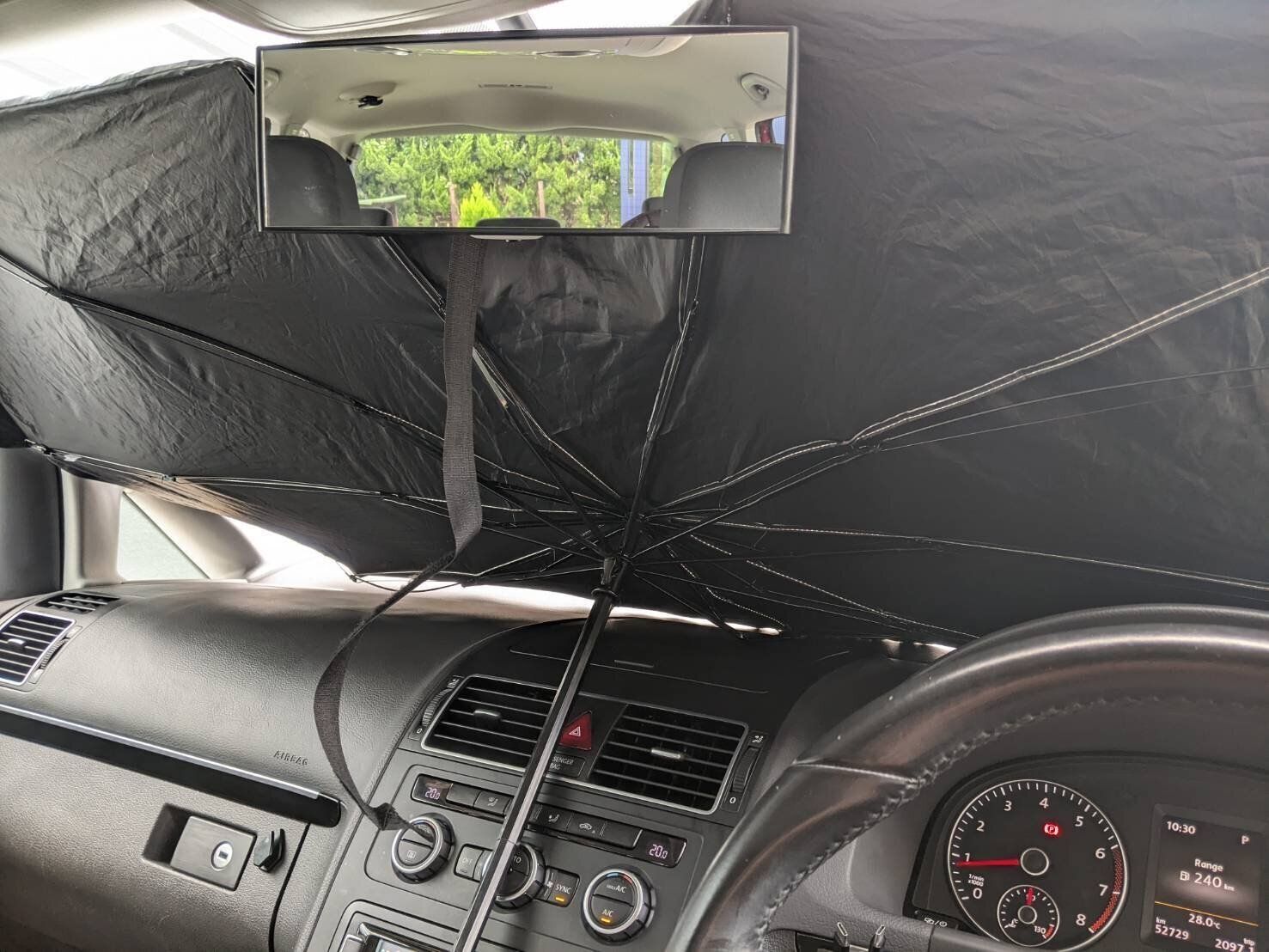 エンジンを切った瞬間から気温上昇が始まる、真夏の車内。特に小さい子どもと一緒だと、ゆっくり丁寧に「傘型サンシェード」を畳んでいる余裕はないので、畳まなくても入る大きめサイズの収納を用意することに!
