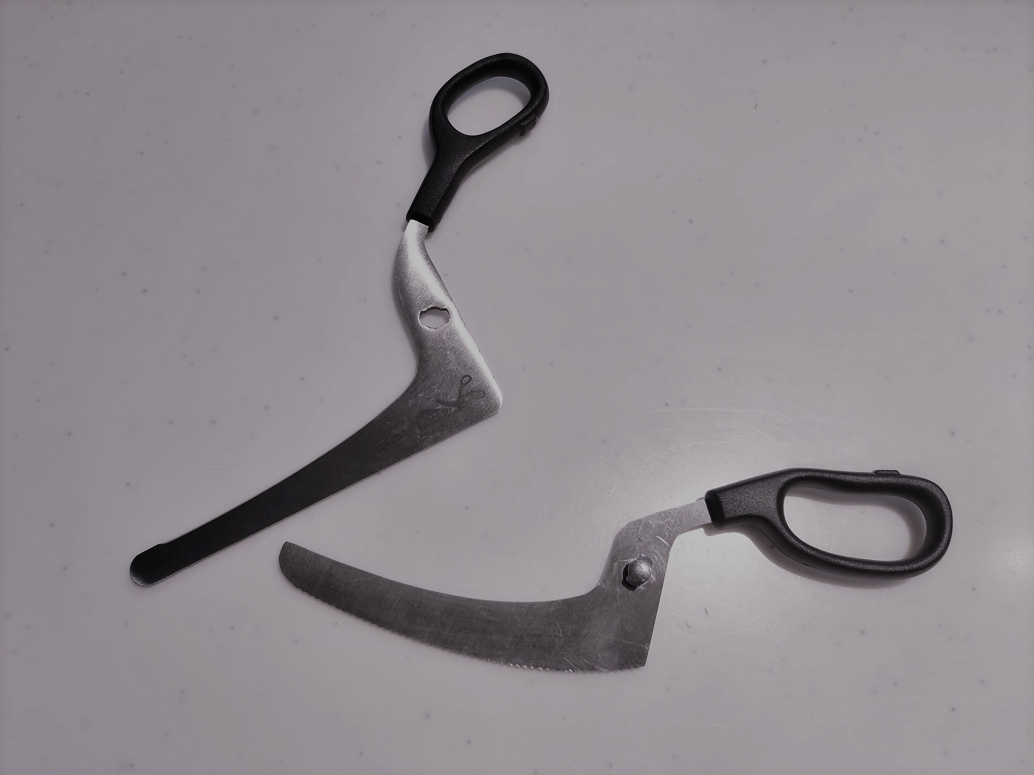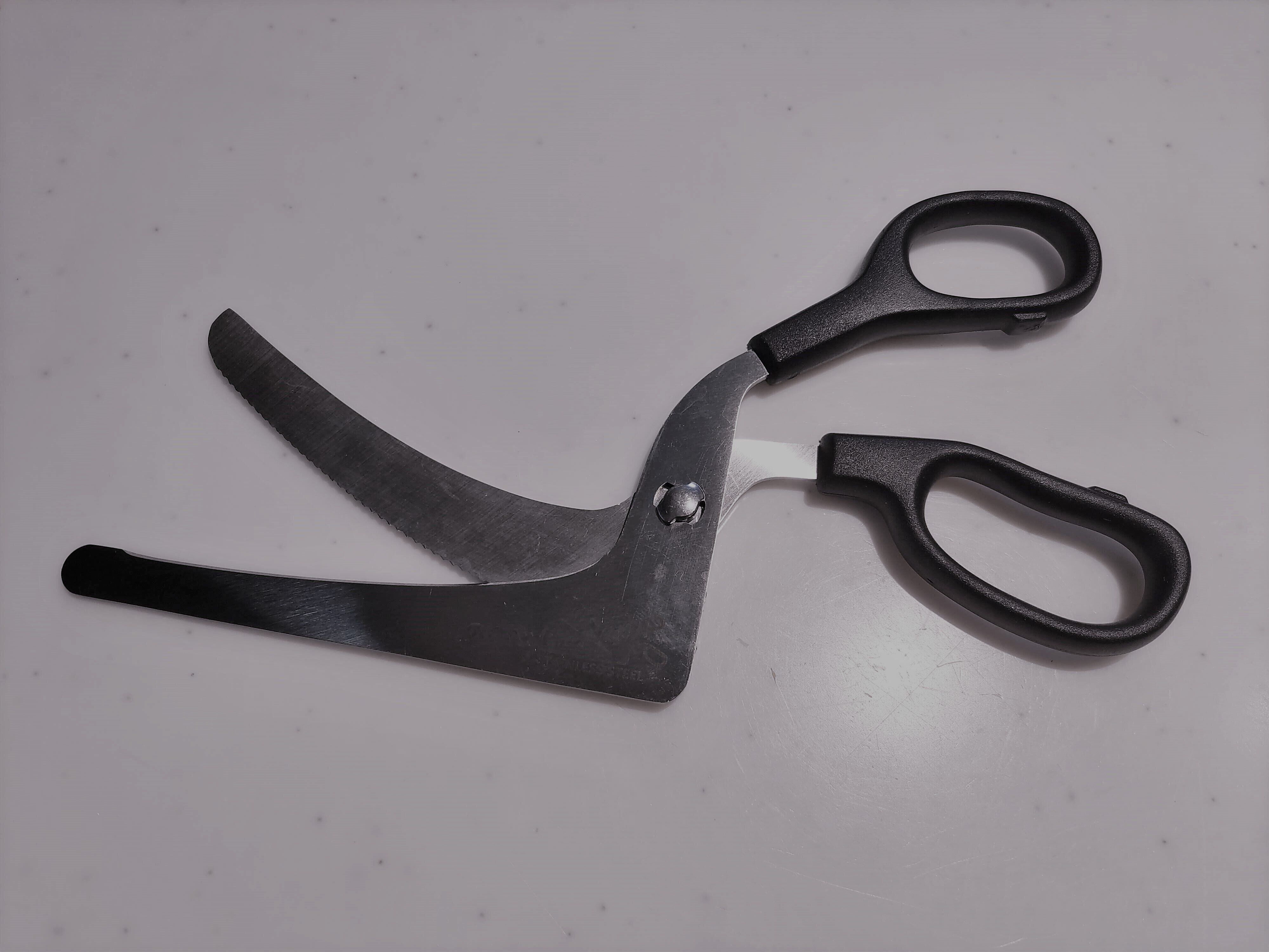 カットしたいものを少し持ち上げれば下の刃を差し込むことができるようになっています。これでピザの端をちょっと持ちあげそこに刃を差し込んで、ハサミでチョキチョキっと切ることができるというものです。