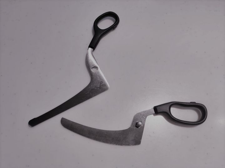 ふつうのハサミの形とは少し違っていて、L字型みたいに刃のところが曲がっています。