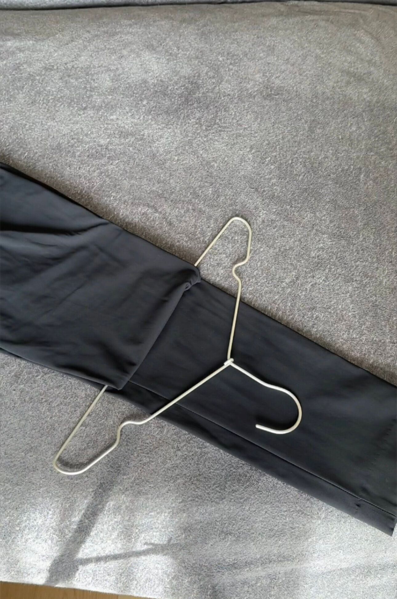 2:もう片方も足の方からハンガーに通し、先ほどの折りたたんだパンツの上から通します。