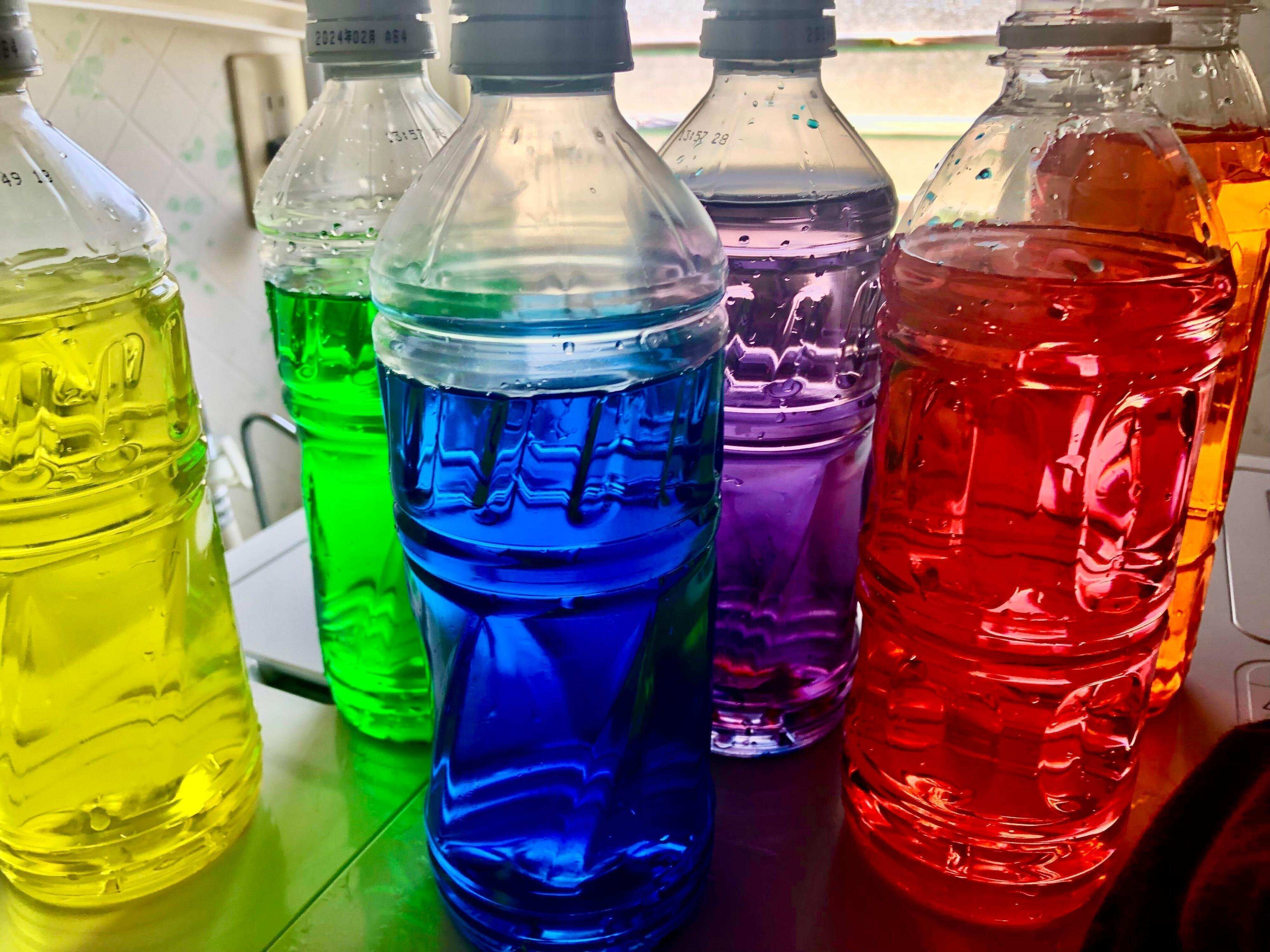市販されている赤・黄・青の食紅を混ぜ合わせてペットボトルに作って、あとはプラスチック製のコップを持ち込んでお風呂でジュース屋さんごっこ。色水で氷を作ってお風呂に入れてあげても喜びます。