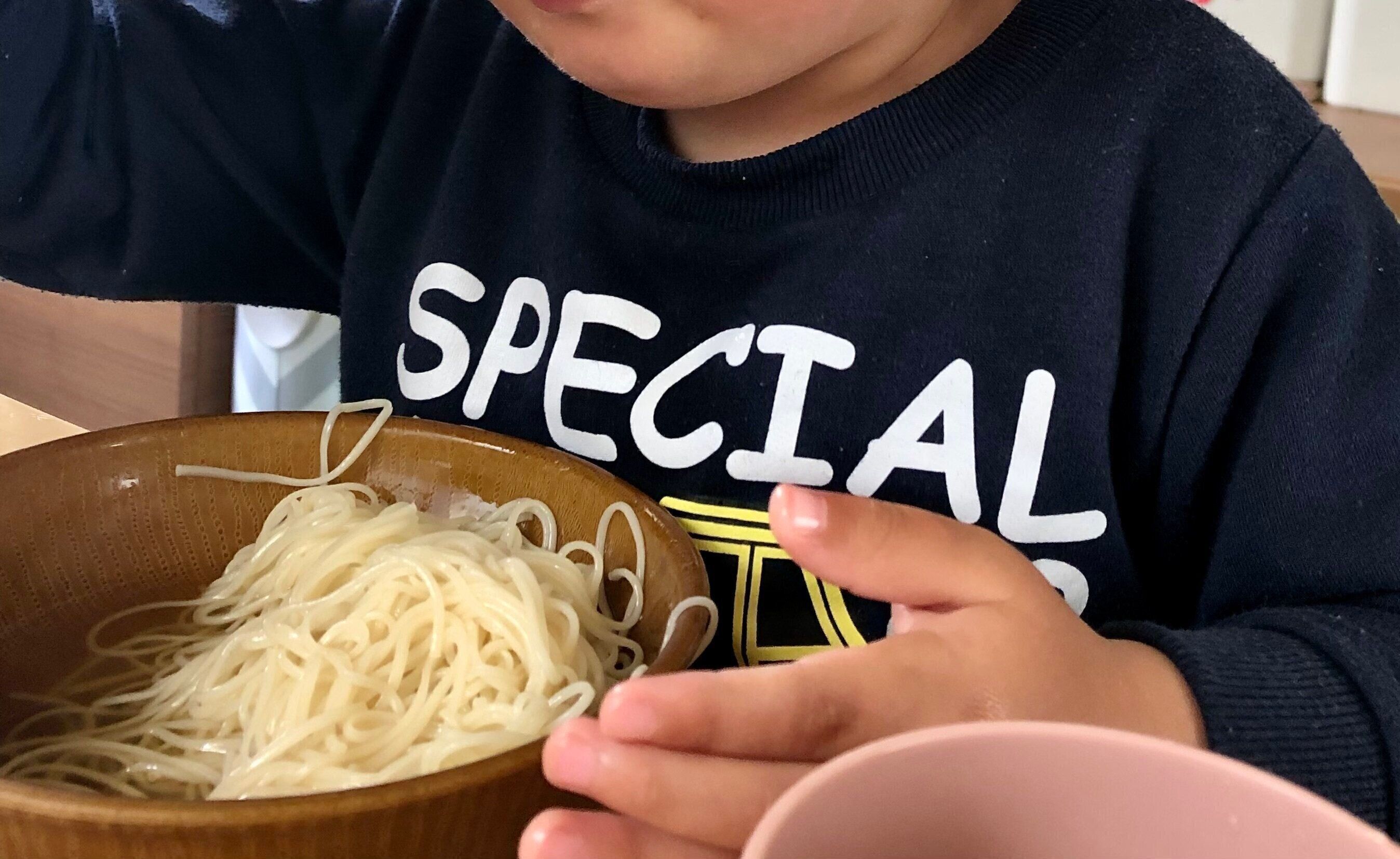 お風呂上がり時点で寝てしまいそうになることもあるので、お昼準備もスピード勝負。夏の定番そうめんが大活躍です。