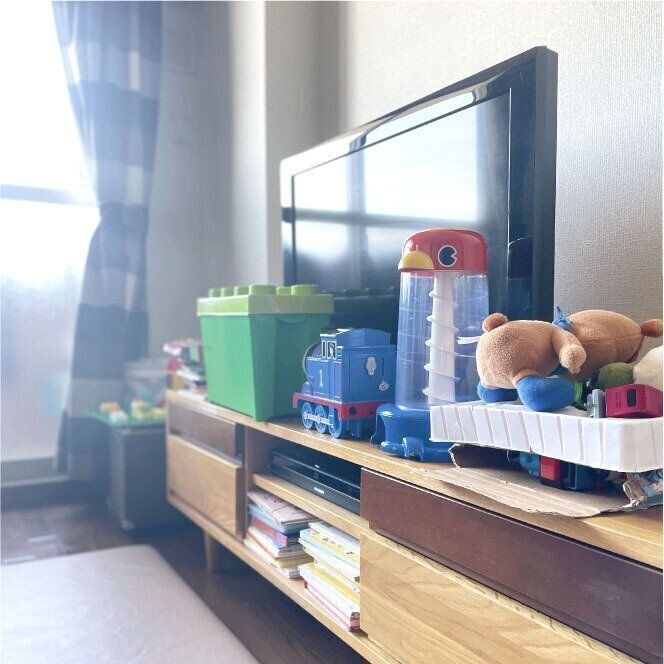 今ではよく使うオモチャを厳選してTVボード周りに置いているだけです。全てのオモチャを出してしまうと、いくら置きっぱなしでも煩雑になるので時々オモチャを入れ替えて子どもと遊んでいます。