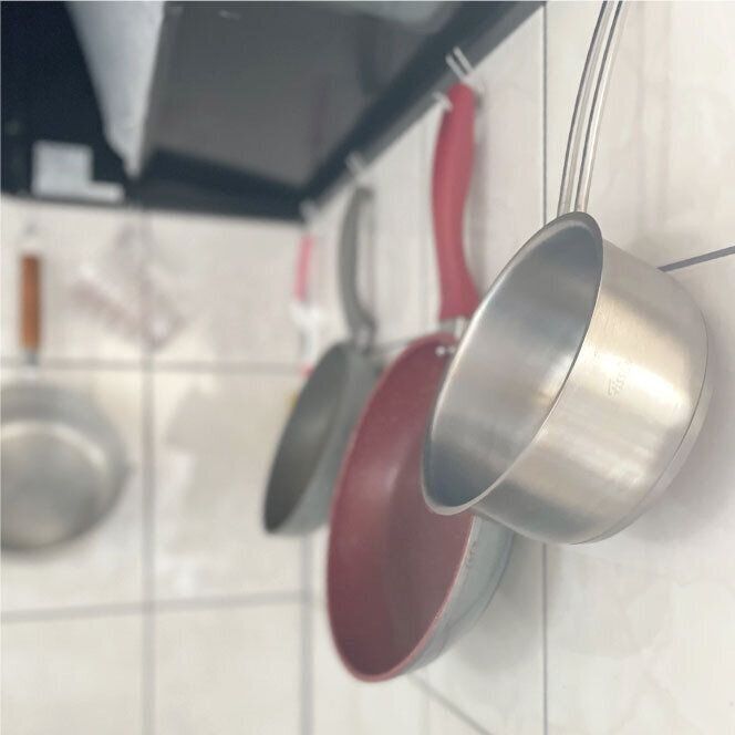 1LDK賃貸で収納スペースも広くなく、調理器具も少ないのでフライパンと鍋は吊るす収納で出しっぱなしです。人によっては油ハネが気になるかもしれませんが、ほぼ毎日使うため汚れも少なく気にしていません。