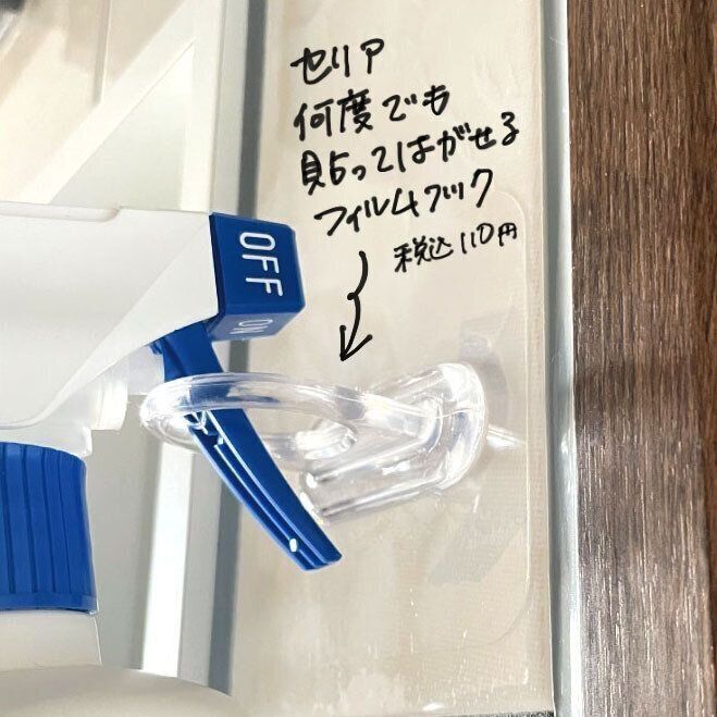 セリアの「何度でも貼ってはがせるフィルムフック」(110円)をキッチンの死角に貼り、アルコール消毒スプレーや掃除用スプレーを引っかけて収納しています。耐荷重も1kgまで大丈夫なので日用品なら安心です。夫も掃除のたびに使うので夫婦それぞれ使いやすい高さに設置しています。