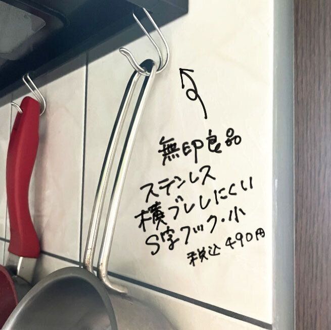 毎日使うフライパンや鍋は無印良品の「ステンレス横ブレしにくいS字フック・小」(490円)を使って収納しています。同じアイテムの大きなサイズ「ステンレス横ブレしにくいS字フック・大」(790円)では子どもの保育園バッグの収納に活用しています。フライパンも保育園バッグも毎日使うモノなので出しっぱなしにすることで、夫婦ともに自然と片づけられてストレスフリーです。