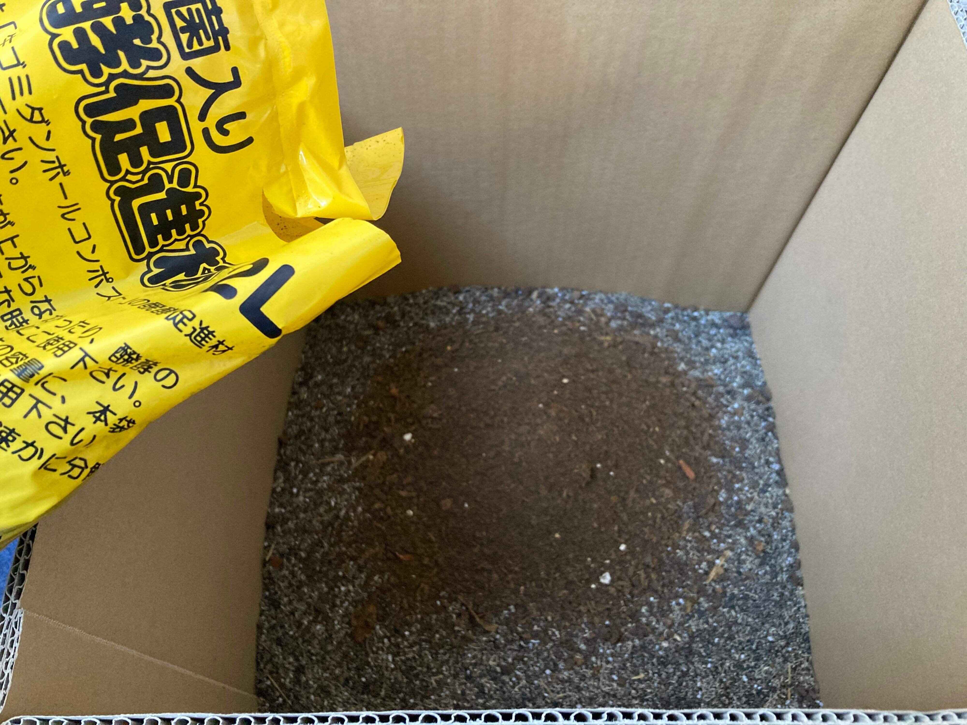 届いたのは入れ物となるダンボール箱と基材、発酵促進剤。