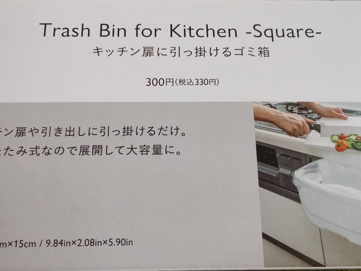 「キッチン扉に引っ掛けるゴミ箱」は330円。その名の通り、キッチンの扉や引き出しの取っ手部分に引っ掛けて使うタイプのゴミ箱です。