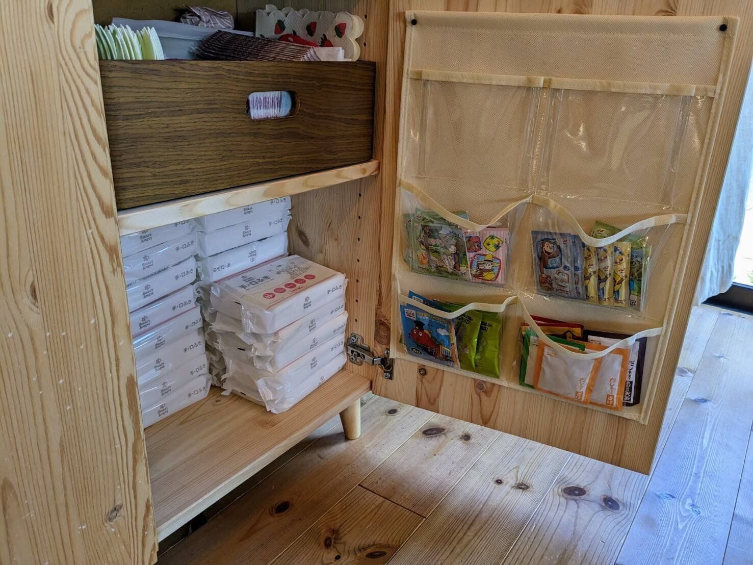 子どもたち自身で今日のお供を選べるよう、チェストの扉裏に「ウォールポケット」を設置し、そこに収納しています。