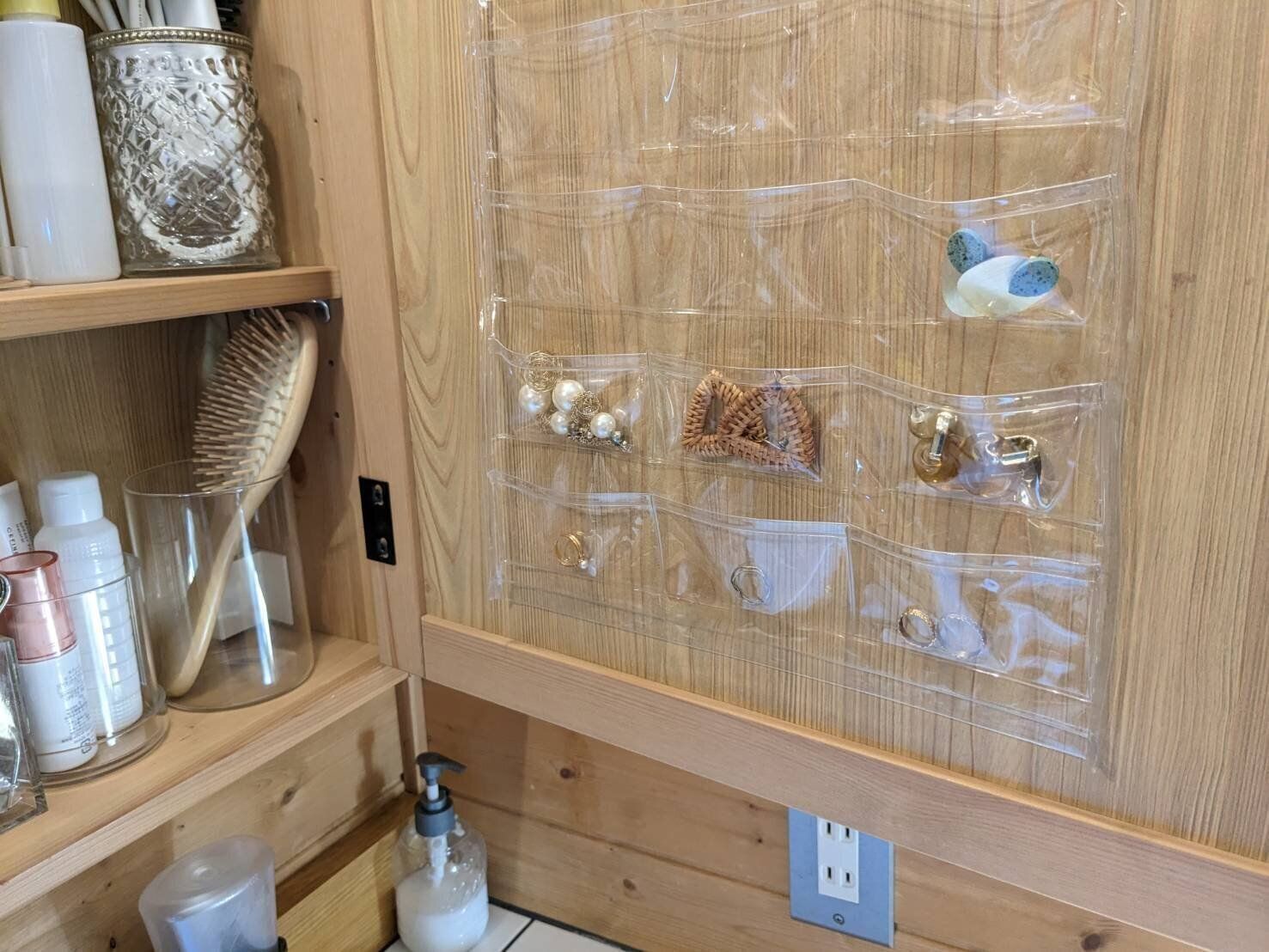 私のアクセサリー収納場所は、洗面所にあるミラーキャビネットの扉裏!娘たちのヘアアクセ同様に、セリアの「ウォールポケット」を使って収納しています。