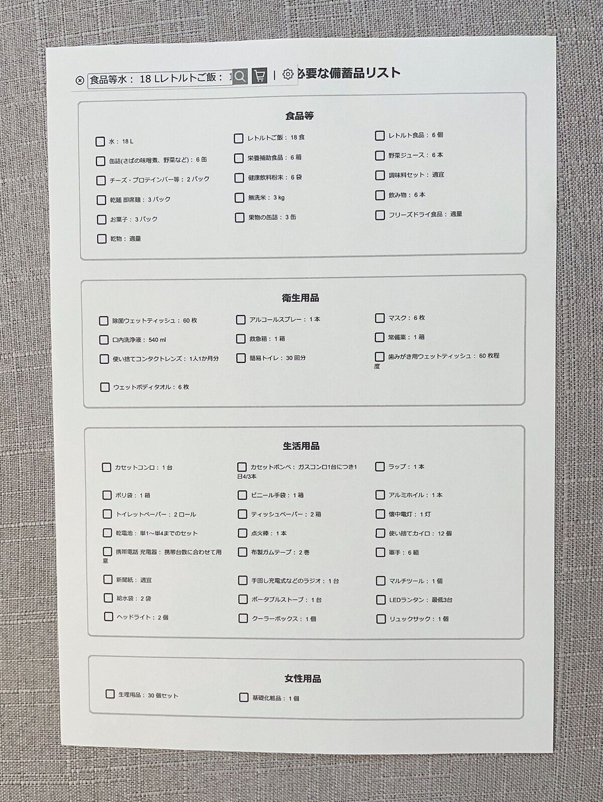 家族構成やペットの有無、戸建てか集合住宅かを選ぶと必要な備蓄の種類と量をリストにしてくれる便利なサイトです。
