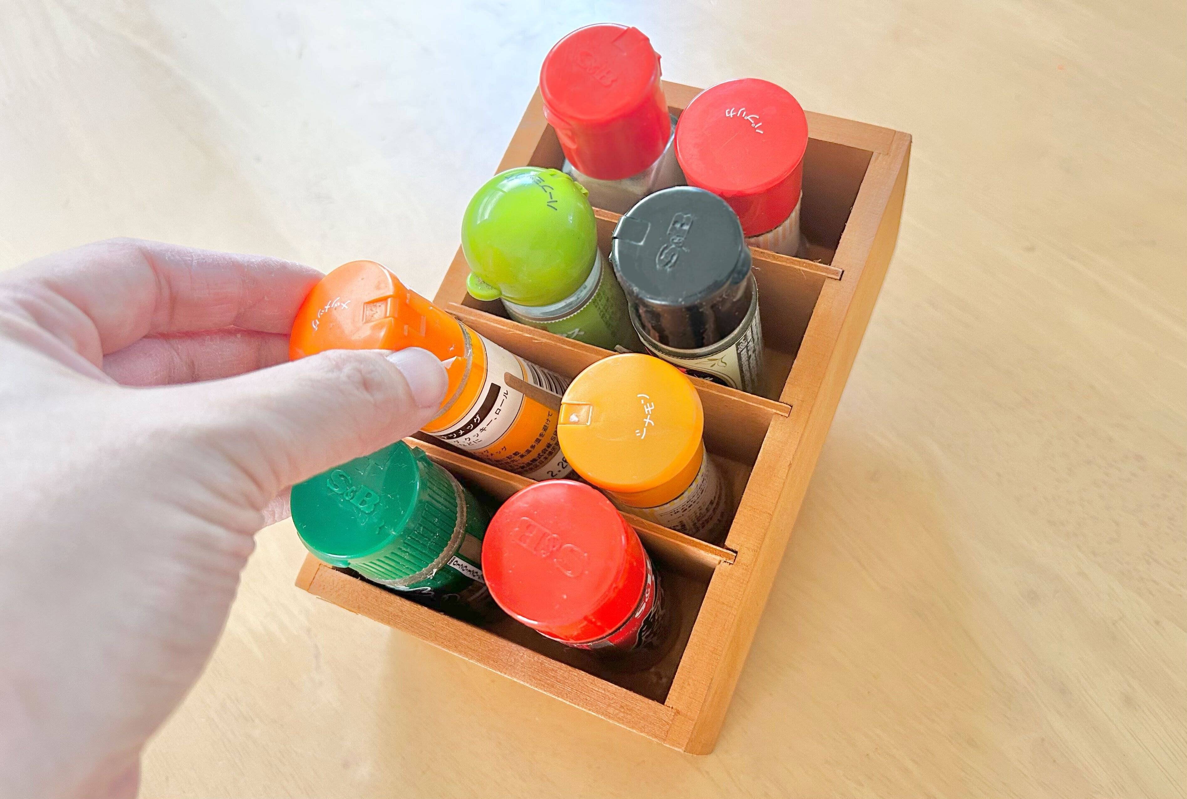 Seriaの「木製仕切りケース」がスパイスの小さなビンを収納するのに便利です。