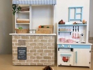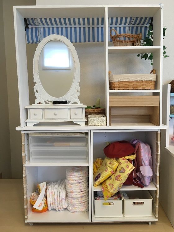 ここゆきさんは、ゆとりのある朝を過ごす為に幼稚園のお子さんが一人で準備ができる「身支度ロッカー」を手作りしました。お店屋さんごっことして愛用のカウンターの裏面はなんと収納棚!幼稚園の物が、一カ所にまとまるように出来ています。お子さんが自分で出し入れできるようにオープン収納にしているアイデアも◎