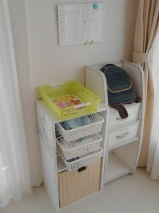 みい太さんは、通学&通園のおでかけセットを子供部屋ではなく、動線を意識した玄関近くの和室に設置しました。また、手作りの棚にはメッシュのかごをセット。中に何が入っているか、お子さんが一目で分かる点も時短のポイント!自分のことは自分でするようになれば、ママも朝が随分ラクになりますよね。