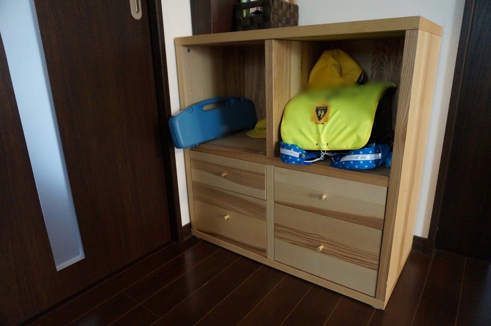 サンキュ!ブロガーoshimiさんは、玄関からリビングに入ってすぐの場所に設置。特に男の子はランドセルを置きっぱなしにしがちだと先輩ママさんから助言をもらっていたので、玄関に近い場所に設置をしたそうです。キャビネットはIKEAの商品を活用しています。