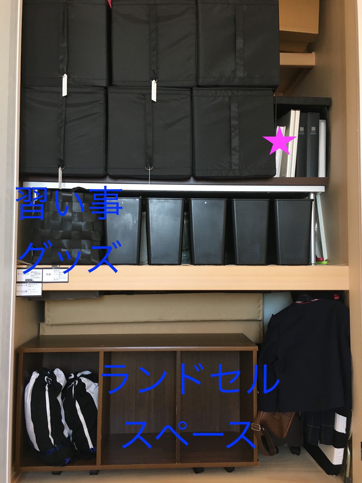 サンキュ!ブロガーkashimiさんは、リビングの隣続きにある和室の押し入れをランドセル収納場所に設置しています。移動しやすいようにカラーボックスにコロをつけ、子供でも動かしやすいように工夫されていますよ。